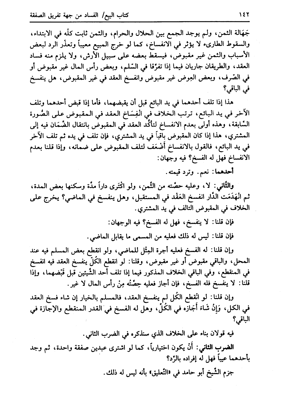 جَهَالة الثمن، ولم يوجد الجمع بين الحلال والحرام، والثمن ثابت كلّه في الابتداء، والسقوط الطارئ لا يؤثر في الانفساخ، كما لو خرج المبيع معيباً وتعذّر الرد لبعض الأسباب والثمن غير مقبوض، فيسقط بعضه على سبيل الأرش، ولا يلزم منه فساد العقد، والطريقان جاريان فيما إذا تفرَّقا في السّلم، وبعض رأس المال غير مقبوض أو في الصّرف، وبعض العِوض غير مقبوض وانفسخ العقد في غير المقبوض، هل ينفسخ في الباقي؟