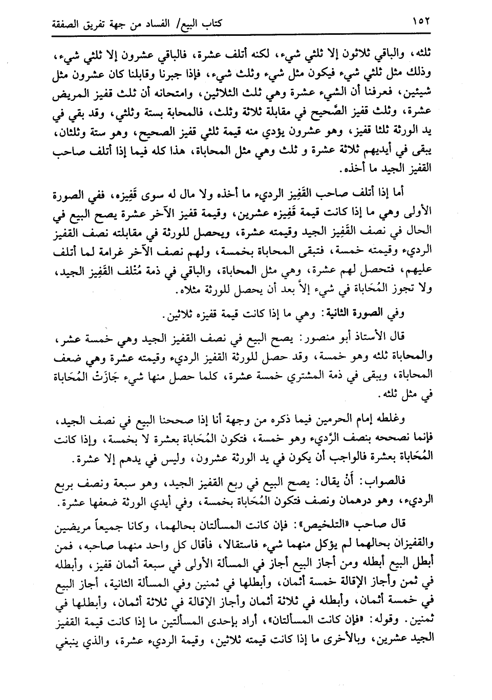 ثلثه، والباقي ثلاثون إلا ثلثي شيء، لكنه أتلف عشرة، فالباقي عشرون إلا ثلثي شيء، وذلك مثل ثلثي شيء فيكون مثل شيء وثلث شيء، فإذا جبرنا وقابلنا كان عشرون مثل شيئين، فعرفنا أن الشيء عشرة وهي ثلث الثلاثين، وامتحانه أن ثلث قفيز المريض عشرة، وثلث قفيز الصَّحيح في مقابلة ثلاثة وثلث، فالمحابة بستة وثلثي، وقد بقي في يد الورثة ثلثا قفيز، وهو عشرون يؤدي منه قيمة ثلثي قفيز الصحيح، وهو ستة وثلثان، يبقى في أيديهم ثلاثة عشرة وثلث وهي مثل المحاباة، هذا كله فيما إذا أتلف صاحب القفيز الجيد ما أخذه.