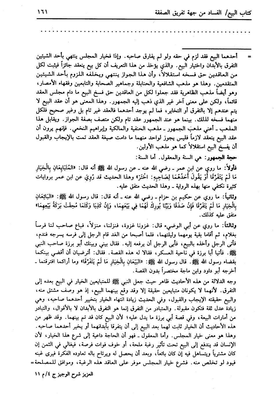 = أحدهما البيع فقد لزم في حقه ولو لم يفارق صاحبه. وإذا فخيار المجلس ينتهي بأحد الشيئين التفرق بالأبدان واختيار البيع. والذي يؤخذ من هذا التعريف أن كل بيع ينعقد جائزاً فيثبت لكل من العاقدين حق فسخه استقلالاً؛ وأن هذا الجواز ينتهي ويخلفه اللزوم بأحد الشيئين المتقدمين. وهذا هو مذهب الشافعية والحنابلة وجماهير الصحابة والتابعين وفقهاء الأمصار، وهو أيضاً مذهب الظاهرية فقد جعلوا لكل من الحاقدين حق فسخ البيع ما دام مجلس العقد قائماً، ولكن على معنى آخر غير الذي ذهب إليه الجمهور. وهذا المعنى هو أن عقد البيع لا يتم عندهم إلا بالفرق أو التخاير، فما لم يوجد أحدهما فالعقد غير تام بل وغير صحيح فلكل منهما فسخه لذلك. بينما هو عند الجمهور عقد تام ولكن متصف بصفة الجواز. ويقابل هذا المذهب -أعني مذهب الجمهور- مذهب الحنفية والمالكية إبراهيم النخعي. فإنهم يرون أن عقد البيع ينعقد لازماً فليس يجوز لواحد منهما ما دامت صيغة العقد تمت بالإيجاب والقبول أن يفسخ البيع استقلالاً كما هو مذهب الأولين.