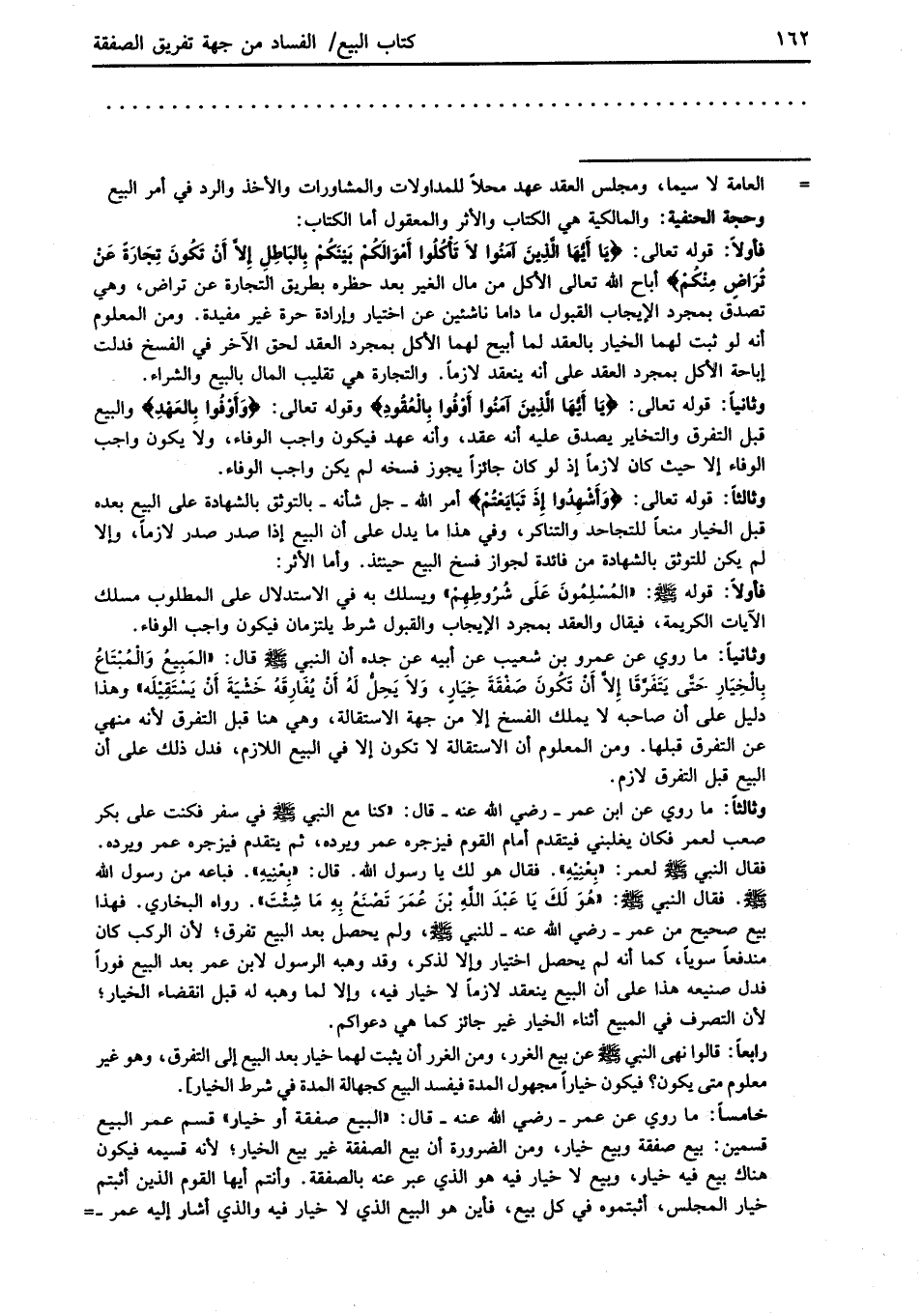 خامساً: ما روي عن عمر -رضي الله عنه- قال: "البيع صفقة أو خيار" قسم عمر البيع قسمين: بيع صفقة وبيع خيار، ومن الضرورة أن بيع الصفقة غير بيع الخيار؛ لأنه قسيمه فيكون هناك بيع فيه خيار، وبيع لا خيار فيه هو الذي عبر عنه بالصفقة. وأنتم أيها القوم الدين أثبتم خيار المجلس، أثبتموه في كل بيع، فأين هو البيع الذي لا خيار فيه والذي أشار إليه عمر - =