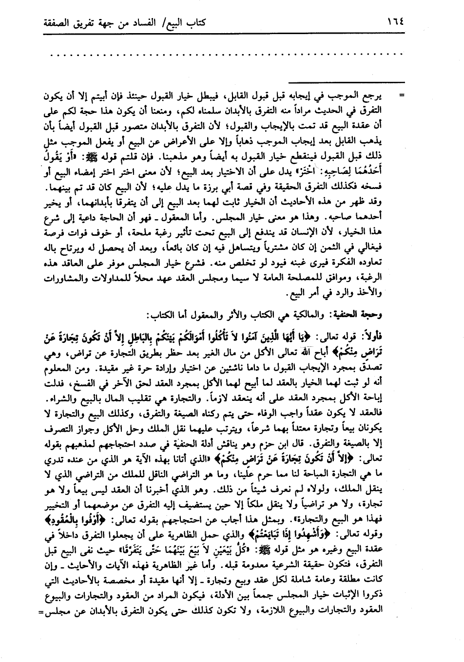 فأولاً: قوله تعالى: {يَاأَيُّهَا الَّذِينَ آمَنُوا لَا تَأْكُلُوا أَمْوَالَكُمْ بَيْنَكُمْ بِالْبَاطِلِ إِلَّا أَنْ تَكُونَ تِجَارَةً عَنْ تَرَاضٍ مِنْكُمْ} أباح الله تعالى الأكل من مال الغير بمد حظر بطريق التجارة عن تراض، وهي تصدق بمجرد الإيجاب القبول ما داما ناشئين عن اختيار وإرادة حرة غير مقيدة. ومن المعلوم أنه لو ثبت لهما الخيار بالعقد لما أبيح لهما الأكل بمجرد العقد لحق الآخر في الفسخ، فدلت إباحة الأكل بمجرد العقد على أنه ينعقد لازماً. والتجارة هي تقليب المال بالبيع والشراء. فالعقد لا يكون عقداً واجب الوفاء حتى يتم ركناه الصيغة والتفرق، وكذلك البيع والتجارة لا يكونان بيعاً وتجارة معتداً بهما شرعاً، ويترتب عليهما نقل الملك وحل الأكل وجواز التصرف إلا بالصيغة والتفرق. قال ابن حزم وهو يناقش أدلة الحنفية في صدد احتجاجهم لمذهبهم بقوله تعالى: {إِلَّا أَنْ تَكُونَ تِجَارَةً عَنْ تَرَاضٍ مِنْكُمْ} "الذي أتانا بهذه الآية هو الذي من عنده تدري ما هي التجارة المباحة لنا مما حرم علينا، وما هو التراضي الناقل للملك من التراضي الذي لا ينقل الملك، ولولاه لم نعرف شيئاً من ذلك. وهو الذي أخبرنا أن العقد ليس بيعاً ولا هو تجارة، ولا هو تراضياً ولا ينقل ملكاً إلا حين يستضيف إليه التفرق عن موضعهما أو التخيير فهذا هو البيع والتجارة". وبمثل هذا أجاب عن احتجاجهم بقوله تعالى: {أَوْفُوا بِالْعُقُودِ} وقوله تعالى: {وَأَشْهِدُوا إِذَا تَبَايَعْتُمْ} والذي حمل الظاهرية على أن يجعلوا التفرق داخلاً في عقدة البيع وغيره هو مثل قوله -صلى الله عليه وسلم-: "كُلُّ بيْعَيْنِ لاَ بَيْعَ بَيْنَهُمَا حَتَّى يَتَفَرَّقَا" حيث نفى البيع قبل التفرق، فتكون حقيقة الشرعية معدومة قبله. وأما غير الظاهرية فهذه الآيات والأحايث -وإن كانت مطلقة وعامة شاملة لكل عقد وبيع وتجارة- إلا أنها مقيدة أو مخصصة بالأحاديث التي ذكروا الاثبات خيار المجلس جمعاً بين الأدلة، فيكون المراد من العقود والتجارات والبيوع العقود والتجارات والبيوع اللازمة، ولا تكون كذلك حتى يكون التفرق بالأبدان عن مجلس =
