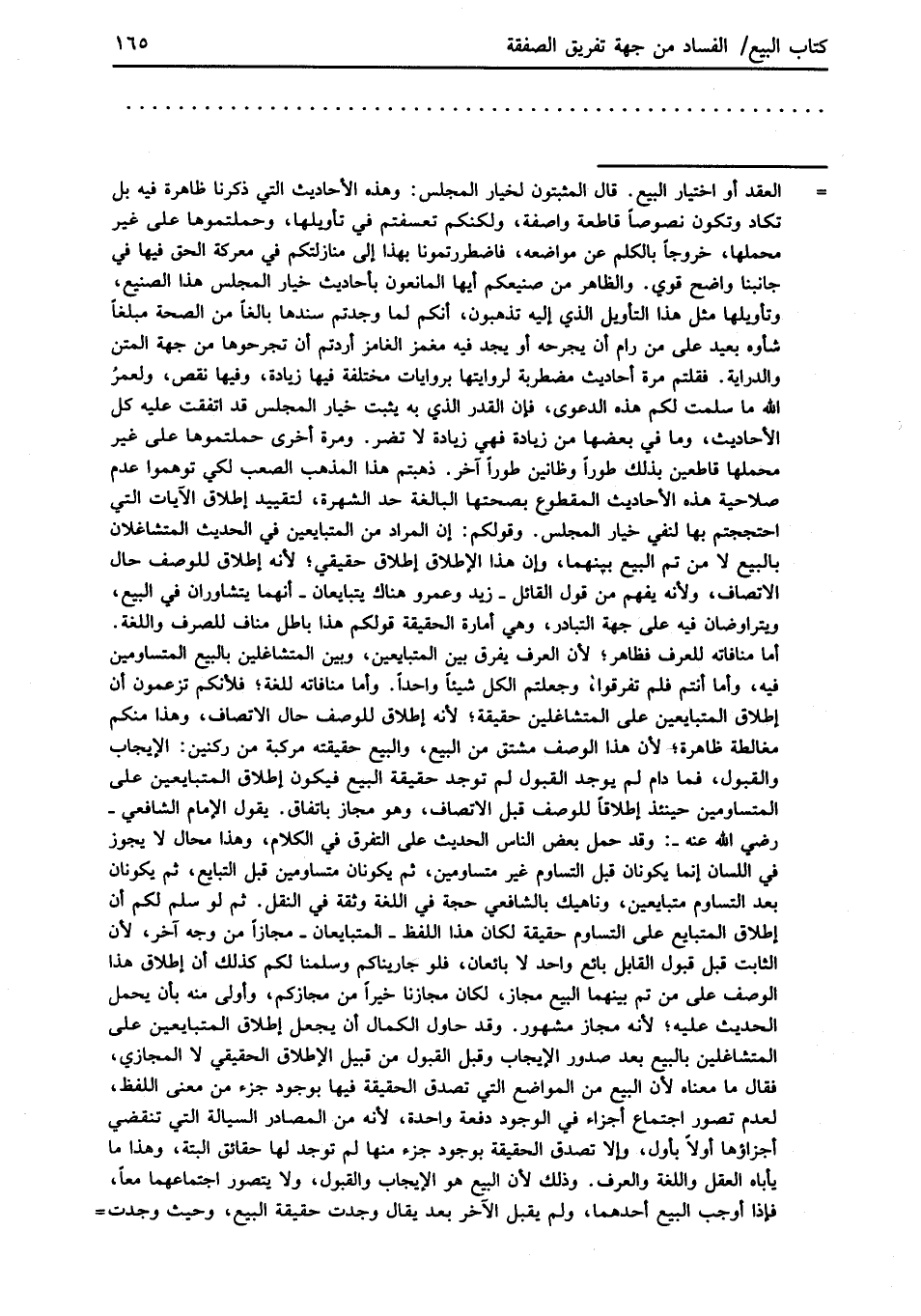 = العقد أو اختيار البيع. قال المثبتون لخيار المجلس: وهذه الأحاديث التي ذكرنا ظاهرة فيه بل تكاد وتكون نصوصاً قاطعة واصفة، ولكنكم تعسفتم في تأويلها، وحملتموها على غير محملها، خروجاً بالكلم عن مواضعه، فاضطررتمونا بهذا إلى منازلتكم في معركة الحق فيها في جانبنا واضح قوي. والظاهر من صنيعكم أيها المانعون بأحاديث خيار المجلس هذا الصنيع، وتأويلها مثل هذا التأويل الذي إليه تذهبون، أنكم لما وجدتم سندها بالغاً من الصحة مبلغاً شأوه بعيد على من رام أن يجرحه أو يجد فيه مغمز الغامز أردتم أن تجرحوها من جهة المتن والدراية. فقلتم مرة أحاديث مضطربة لروايتها بروايات مختلفة فيها زيادة، وفيها نقص، ولعمرُ الله ما سلمت لكم هذه الدعوى، فإن القدر الذي به يثبت خيار المجلس قد اتفقت عليه كل الأحاديث، وما في بعضها من زيادة فهي زيادة لا تضر. ومرة أخرى حملتموها على غير محملها قاطعين بذلك طوراً وظانين طوراً آخر. ذهبتم هذا المذهب الصعب لكي توهموا عدم صلاحية هذه الأحاديث المقطوع بصحتها البالغة حد الشهرة، لتقييد إطلاق الآيات التي احتججتم بها لنفي خيار المجلس. وقولكم: إن المراد من المتبايعين في الحديث المتشاغلان بالبيع لا من تم البيع ببنهما، وإن هذا الإطلاق إطلاق حقيقي؛ لأنه إطلاق للوصف حال الاتصاف، ولأنه يفهم من قول القائل -زيد وعمرو هناك يتبايعان- أنهما يتشاوران في البيع، ويتراوضان فيه على جهة التبادر، وهي أمارة الحقيقة قولكم هذا باطل مناف للصرف واللغة. أما منافاته للعرف فظاهر؛ لأن العرف يفرق بين المتبايعين، وبين المتشاغلين بالبيع المتساومين فيه، وأما أنتم فلم تفرقوا؛ وجعلتم الكل شيئاً واحداً. وأما منافاته للغة؛ فلأنكم تزعمون أن إطلاق المتبايعين على المتشاغلين حقيقة؛ لأنه إطلاق للوصف حال الاتصاف، وهذا منكم مغالطة ظاهرة؛ لأن هذا الوصف مشتق من البيع، والبيع حقيقته مركبة من ركنين: الإيجاب والقبول، فما دام لم يوجد القبول لم توجد حقيقة البيع فيكون إطلاق المتبايعين على المتساومين حينئذ إطلاقاً للوصف قبل الاتصاف، وهو مجاز باتفاق. يقول الإمام الشافعي -رضي الله عنه-: وقد حمل بعض الناس الحديث على التفرق في الكلام، وهذا محال لا يجوز في اللسان إنما يكونان قبل التساوم غير متساومين، ثم يكونان متساومين قبل التبايع، ثم يكونان بعد التساوم متبايعين، وناهيك بالشافعي حجة في اللغة وثقة في النقل. ثم لو سلم لكم أن إطلاق المتبايع على التساوم حقيقة لكان هذا اللفظ -المتبايعان- مجازاً من وجه آخر، لأن الثابت قبل قبول القابل بائع واحد لا بائعان، فلو جاريناكم وسلمنا لكم كذلك أن إطلاق هذا الوصف على من تم بينهما البيع مجاز، لكان مجازنا خيراً من مجازكم، وأولى منه بأن يحمل الحديث عليه؛ لأنه مجاز مشهور. وقد حاول الكمال أن يجعل إطلاق المتبايعين على المتشاغلين بالبيع بعد صدور الإيجاب وقبل القبول من قبيل الإطلاق الحقيقي لا المجازي، فقال ما معناه لأن البيع من المواضع التي تصدق الحقيقة فيها بوجود جزء من معنى اللفظ، لعدم تصور اجتماع أجزاء في الوجود دفعة واحدة، لأنه من المصادر السيالة التي تنقضي أجزاؤها أولاً بأول، وإلا تصدق الحقيقة بوجود جزء منها لم توجد لها حقائق البتة، وهذا ما يأباه العقل واللغة والعرف. وذلك لأن البيع هو الإيجاب والقبول، ولا يتصور اجتماعهما معاً، فإذا أوجب البيع أحدهما، ولم يقبل الآخر بعد يقال وجدت حقيقة الببع، وحيث وجدت =