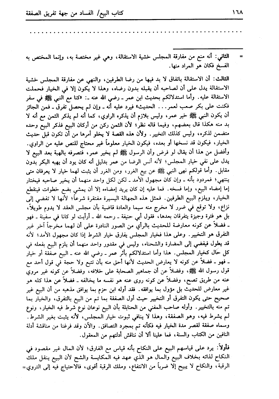 الثالث: أن الاستقالة باتفاق لا بد فيها من رضا الطرفين، والنهي عن مفارقة المجلس خشية الاستقالة يدل على أن لصاحبه أن يقبله بدون رضاه، وهذا لا يكون إلا في الخيار فحملت الاستقالة عليه. وأما استدلالكم بحديث ابن عمر -رضي الله عنه-: "كنا مع النبي في سفر فكنت على بكر صعب لعمر ... الحديث" فيرد عليه أنه -وإن لم يحصل تفرق- فمن الجائز أن يكون النبي -صلى الله عليه وسلم- خير عمر، وليس بلازم أن يذكره الراوي، كما أنه لا يذكر الثمن مع أنه لا بد منه هكذا قال بعضهم، وفيما قاله نظر؛ لأن الثمن ركن من أركان البيع فذكر البيع وحده متضمن لذكره، وليس كذلك التخيير. ولأن هذه القصة لا يخلو أمرها من أن تكون قبل حديث الخيار، فيكون قد نسخها أو بعده، فيكون الخيار معلوماً غير محتاج للنص عليه من الراوي. وأفضل من هذا أن يقال لو فرض وأن الرسول -صلى الله عليه وسلم- لم يخير عمر، فتصرفه بالهبة بعد البيع لا يدل على نفي خيار المجلس؛ لأنه أنس الرضا من عمر بدليل أنه كان يود أن يهبه البكر بدون مقابل. وأما قولكم نهى النبي -صلى الله عليه وسلم- عن بيع الغرر، ومن الغرر أن يثبت لهما خيار لا يعرفان متى ينتهي؛ فمردود بأنه -وإن كان مجهول الأمد- لكن لكل واحد منهما أن يخير صاحبه فيختار إما إمضاء البيع، وإما فسخه. فما عليه إن كان يريد إمضاءه إلا أن يمشي بضع خطوات فينقطع الخيار، ويلزم البيع الطرفين. فمثل هذه الجهالة اليسيرة مفتقرة شرعاً؛ لأنها لا تفضي إلى نزاع، ولا توقع في ضرر لا مخرج منه سيما والعادة قاضية بأن مجلس العقد لا يدوم طويلاً، بل هو فترة وجيزة يتفرقان بعدها، فقول أبي حنيفة -رحمه الله- أرأيت لو كانا في سفينة -فهو- فضلاً عن كونه معارضة للحديث بالرأي من الصور النادرة على أن لهما مخرجاً آخر غير التفرق هو التخيير. وعلى هذا فخيار المجلس يفارق خيار الشرط إذا كان مجهول الأمد؛ لأنه قد يطول فيفضي إلى المضارة والشحناء، وليس في مقدور واحد منهما أن يلزم البيع بفعله في كل حَال كخيار المجلس. هذا وأما استدلالكم بأثر عمر -رضي الله عنه- البيع صفقة أو خيار -فهو- فضلاً عن كونه لا يعارض الحديث لأنها أحق منه بأن تتبع ولا حجة في قول أحد مع قول رسول الله -صلى الله عليه وسلم-، وفضلاً عن أن جماهير الصحابة على خلافه، وفضلاً عن كونه غير مروي عنه من طريق تصح، وفضلاً عن كونه روى عنه هو نفسه ما يخالفه -فضلاً عن هذا كله هو غير معارض للحديث بل مؤول بما يوافقه. فقد أوله ابن حزم بما يوافق مذهبه من أن البيع غير صحيح حتى يكون التفرق أو التخيير حيث أول الصفقة بما تم من البيع بالتفرق، والخيار بما تم منه بالتخيير. وأوله صاحب المغني من الحنابلة بأن البيع نوعان نوع شرط فيه الخيار، ونوع لم يشرط فيه، وهو الصفقة، وهذا لا ينافي ثبوت خيار المجلس، لأنه يثبت بغير الشرط. وسماه صفقة لقصر مدة الخيار فيه فكأنه تم بمجرد التصافق. والآن وقد فرغنا من مناقشة أدلة النافين من الكتاب والسنة، فما علينا ألا أن نناقش أدلتهم من المعقول.