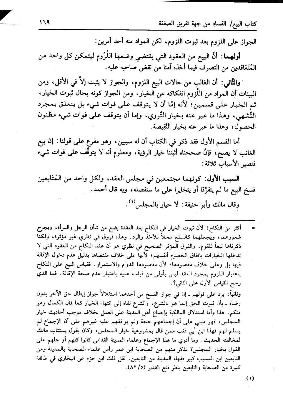 وثانياً: يرد على قولهم -إن في جواز الفسخ من أحدهما استقلالاً جواز إبطال حق الآخر بدون رضاه- بأن ثبوت الحق إنما هو بالشرع، والشرع نفاه إلى انتهاء الخيار كما قال الكمال وهو منكم. هذا وأما استدلال المالكية لإجماع أهل المدينة على العمل بخلاف موجب أحاديث خيار المجلس، فهو مبني على أن إجماعهم حجة ولم يوافقهم عليه غيرهم على أن الإجماع لم يسلم لهم فهذا ابن أبي ذئب ممن قال بمشروعية خيار المجلس، وكان يقول يستتاب مالك لمخالفته الحديث. وما أدري ما هذا الإجماع وعلماء المدينة القدامى كانوا كلهم أو جلهم على القول بخيار المجلس؟ نذكر منهم من الصحابة ابن عمر رأس علماء الصحابة بالمدينة ومن التابعين ابن المسيب كبير فقهاء المدينة من التابعين. نقل ذلك ابن حزم عن البخاري في طائفة كبيرة من الصحابة والتابعين ينظر فتح القدير (5/ 82).