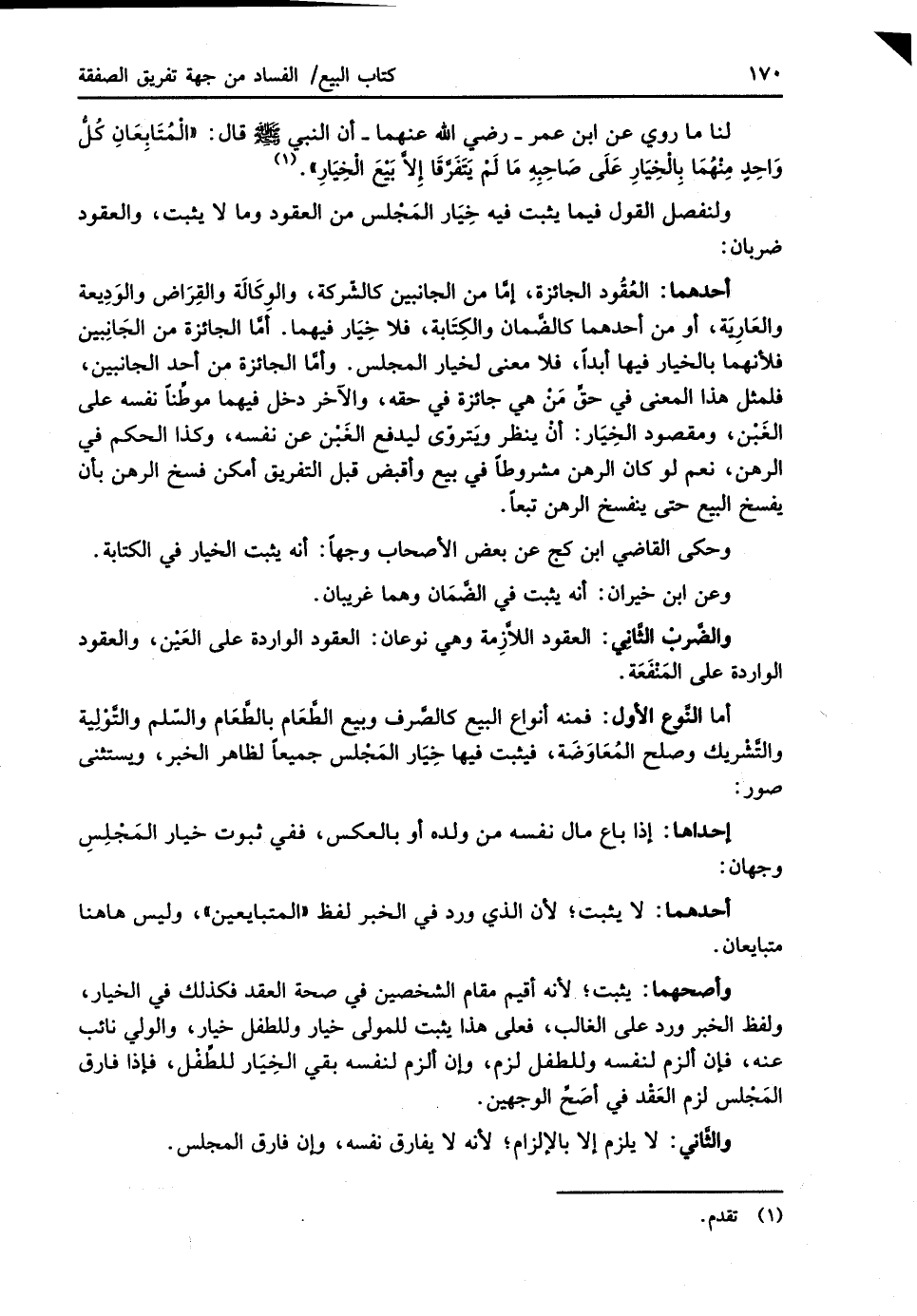 ولنفصل القول فيما يثبت فيه خِيَار المَجْلس من العقود وما لا يثبت، والعقود ضربان: