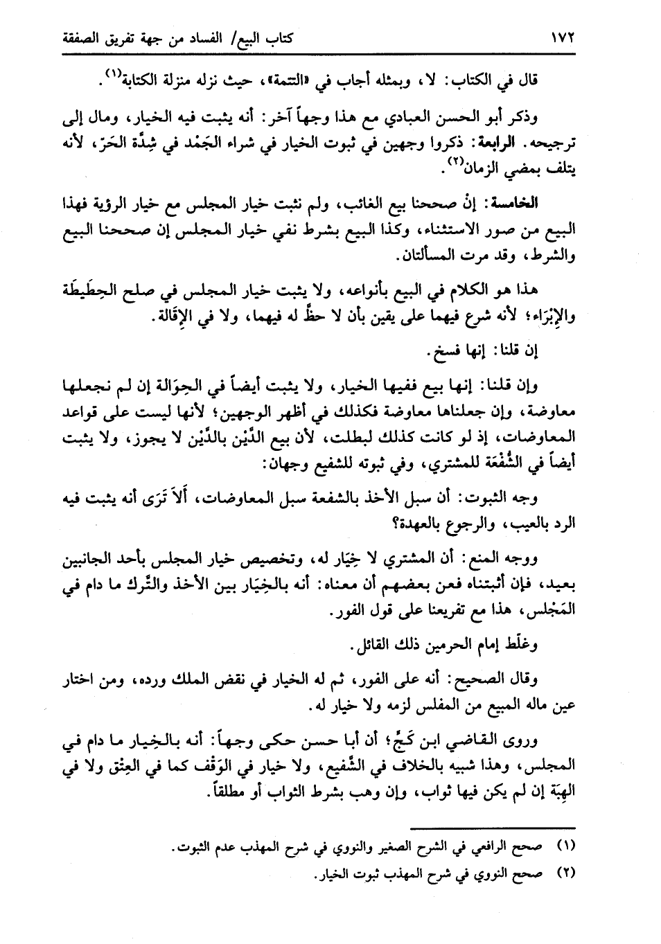 وذكر أبو الحسن العبادي مع هذا وجهاً آخر: أنه يثبت فيه الخيار، ومال إلى ترجيحه. الرابعة: ذكروا وجهين في ثبوت الخيار في شراء الجَمْد في شِدَّة الحَرّ، لأنه يتلف بمضي الزمان (¬2).