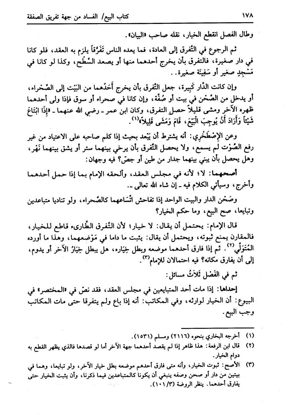 (¬3) الأصح: ثبوت الخيار، وأنه متى فارق أحدهم موضعه بطل خيار الآخر، ولو تبايعا، وهما في بيتين من دار أو صحن وصفه ينبغي أن يكونا كالمتباعدين فيما ذكرنا، وأن يثبت الخيار حتى يفارق أحدهما. ينظر الروضة (3/ 101).