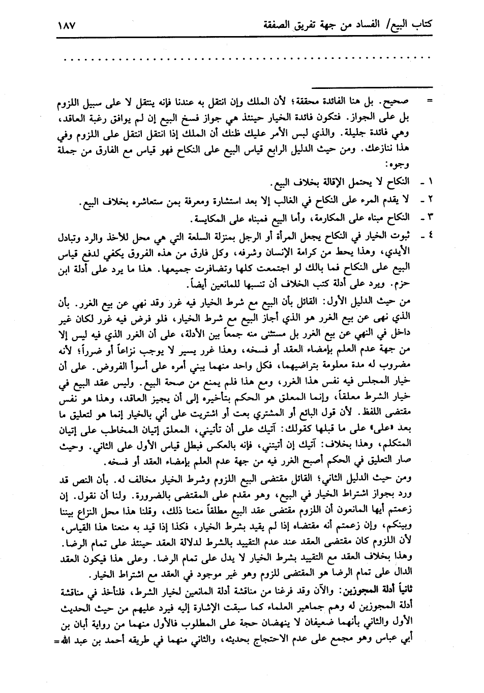= صحيح. بل هنا الفائدة محققة؛ لأن الملك وإن انتقل به عندنا فإنه ينتقل لا على سبيل اللزوم بل على الجواز. فتكون فائدة الخيار حينئذ هي جواز فسخ البيع إن لم يوافق رغبة العاقد، وهي فائدة جليلة. والذي لبس الأمر عليك ظنك أن الملك إذا انتقل انتقل على اللزوم وفي هذا ننازعك. ومن حيث الدليل الرابع قياس البيع على النكاح فهو قياس مع الفارق من جملة وجوه: