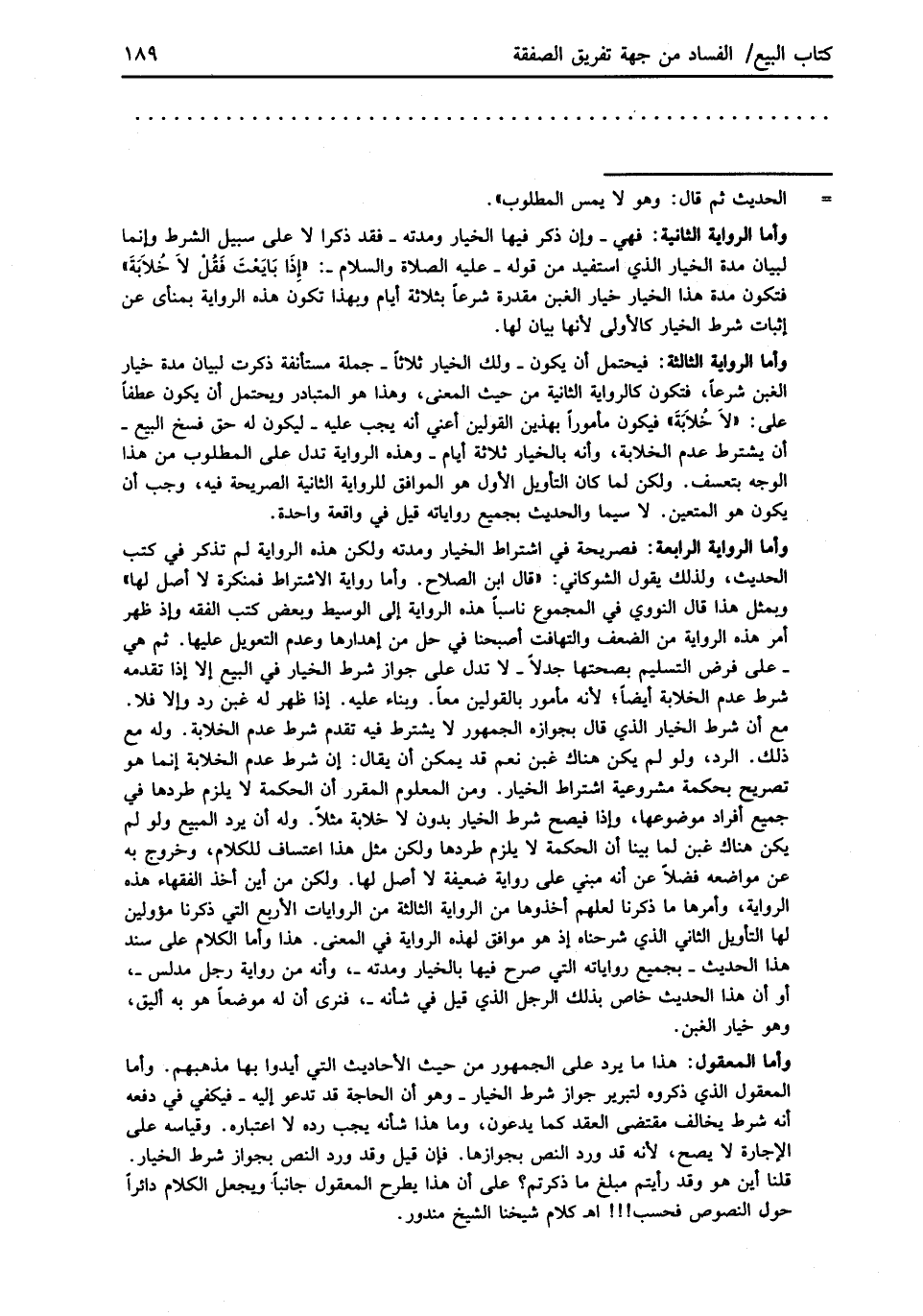 وأما المعقول: هذا ما يرد على الجمهور من حيث الأحاديث التي أيدوا بها مذهبهم. وأما المعقول الذي ذكروه لتبرير جواز شرط الخيار -وهو أن الحاجة قد تدعو إليه- فيكفي في دفعه أنه شرط يخالف مقتضى العقد كما يدعون، وما هذا شأنه يجب رده لا اعتباره. وقياسه على الإجارة لا يصح، لأنه قد ورد النص بجوازها. فإن قيل وقد ورد النص بجواز شرط الخيار. قلنا أين هو وقد رأيتم مبلغ ما ذكرتم؟ على أن هذا يطرح المعقول جانباً ويجعل الكلام دائراً حول النصوص فحسب!!! اهـ كلام شيخنا الشيخ مندور.