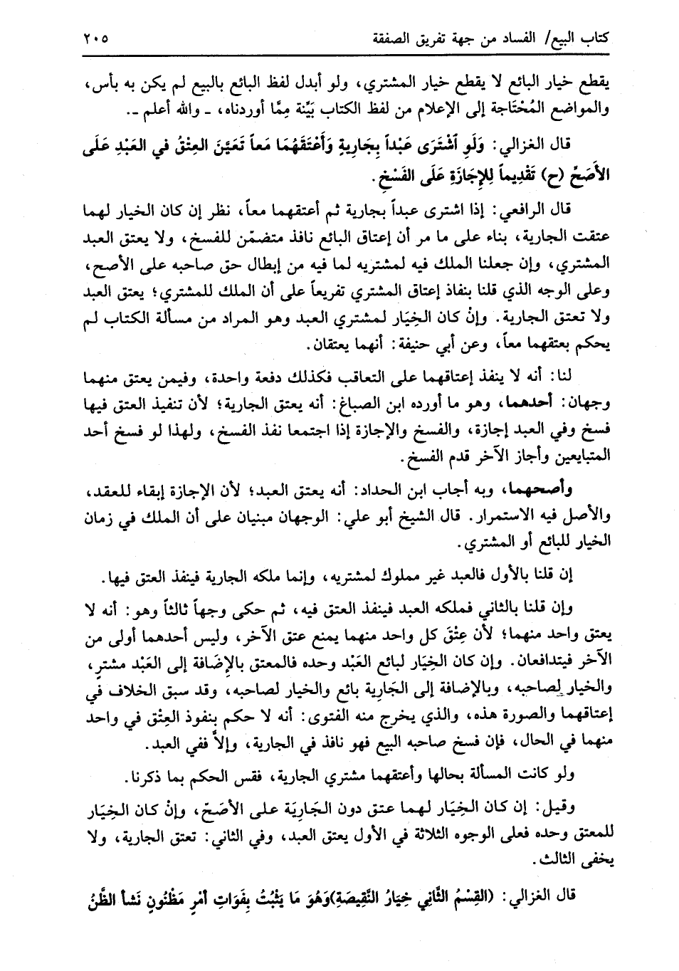 قال الغزالي: وَلَوِ اشْتَرَى عَبْداً بِجَارِيةٍ وَأَعْتَقَهُمَا مَعاً تَعَيَّنَ العِتْقُ في العَبْدِ عَلَى الأَصَحِّ (ح) تَقْدِيماً لِلإجَازَةِ عَلَى الفَسْخِ.