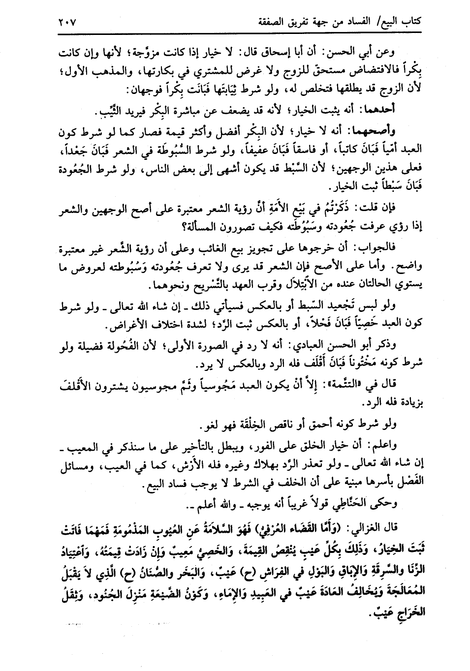 قال الغزالي: (وَأَمَّا القَضَاء العُرْفِيُّ) فَهُوَ السَّلاَمَةُ عَنِ العُيُوبِ المَذْمُومَةِ فَمَهْمَا فَاتَتْ ثَبَتَ الخِيَارُ، وَذَلِكَ بِكُلِّ عَيْبٍ يُنْقِصُ القِيمَةَ، وَالخَصِيُّ مَعِيبٌ وَإِنْ زَادَتْ قِيمَتُهُ، وَاعْتِيَادُ الزِّنَا والسَّرِقَةِ وَالِإبَاقِ وَالبَوْلِ في الفِرَاشِ (ح) عَيْبٌ، وَالبَخَر والصُّنَانُ (ح) الَّذِي لاَ يَقْبَلُ المُعَالَجَةَ وَيُخَالِفُ العَادَةَ عَيْبٌ في العَبِيدِ وَالإِمَاءِ، وَكَوْنُ الضَّيْعَةِ مَنْزِلَ الجُنُود، وَثِقَلُ الخَرَاجِ عَيْبٌ.
