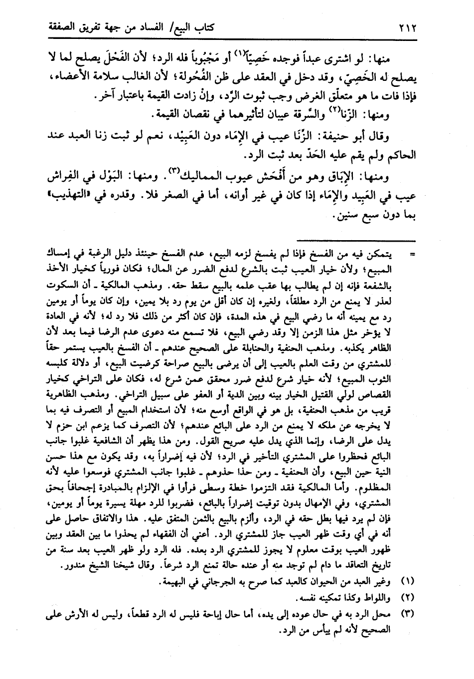= يتمكن فيه من الفسخ فإذا لم يفسخ لزمه البيع، عدم الفسخ حينئذ دليل الرغبة في إمساك المبيع؛ ولأن خيار العيب ثبت بالشرع لدفع الضرر عن المال؛ فكان فورياً كخيار الأخذ بالشفعة فإنه إن لم يطالب بها عقب علمه بالبيع سقط حقه. ومذهب المالكية -أن السكوت لعذر لا يمنع من الرد مطلقاً، ولغيره إن كان أقل من يوم رد بلا يمين، وإن كان يوماً أو يومين رد مع يمينه أنه ما رضي البيع في هذه المدة، فإن كان أكثر من ذلك فلا رد له؛ لأنه في العادة لا يؤخر مثل هذا الزمن إلا وقد رضي البيع، فلا تسمع منه دعوى عدم الرضا فيما بعد لأن الظاهر يكذبه. ومذهب الحنفية والحنابلة على الصحيح عندهم- أن الفسخ بالعيب يستمر حقاً للمشتري من وقت العلم بالعيب إلى أن يرضى بالبيع صراحة كرضيت البيع، أو دلالة كلبسه الثوب المبيع؛ لأنه خيار شرع لدفع ضرر محقق ممن يشرع له، فكان على التراخي كخيار القصاص لولي القتيل الخيار بينه وبين الدية أو العفو على سبيل التراخي. ومذهب الظاهرية قريب من مذهب الحنفية، بل هو في الواقع أوسع منه؛ لأن استخدام المبيع أو التصرف فيه بما لا يخرجه عن ملكه لا يمنع من الرد على البائع عندهم؛ لأن التصرف كما يزعم ابن حزم لا يدل على الرضا، وإنما الذي يدل عليه صريح القول. ومن هذا يظهر أن الشافعية غلبوا جانب البائع فحظروا على المشتري التأخير في الرد؛ لأن فيه إضراراً به، وقد يكون مع هذا حسن النية حين البيع، وأن الحنفية -ومن حذا حذوهم- غلبوا جانب المشتري فوسعوا عليه لأنه المظلوم. وأما المالكية فقد التزموا خطة وسطى فرأوا في الإلزام بالمبادرة إجحافاً بحق المشترى، وفي الإمهال بدون توقيت إضراراً بالبائع، فضربوا للرد مهلة يسيرة يوماً أو يومين، فإن لم يرد فيها بطل حقه في الرد، وألزم بالبيع بالثمن المتفق عليه. هذا والاتفاق حاصل على أنه في أي وقت ظهر العيب جاز للمشتري الرد. أعني أن الفقهاء لم يحذوا ما بين العقد وبين ظهور العيب بوقت معلوم لا يجوز للمشتري الرد بعده. فله الرد ولو ظهر العيب بعد سنة من تاريخ التعاقد ما دام لم توجد منه أو عنده حالة تمنع الرد شرعاً. وقال شيخنا الشيخ مندور.