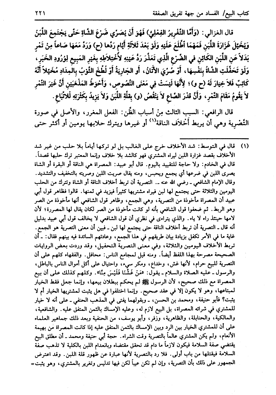 قال الغزالي: (وَأَمَّا التَّغْرِيرُ الفِعْلِيُّ) فَهُوَ أَنْ يُصَرِّي ضَرْعَ الشَّاةِ حَتَّى يَجْتَمِعَ اللَّبَنُ وَيُخَيِّلَ غَزَارَةَ اللَّبَنِ فَمَهْمَا اطَّلَعَ عَلَيْهِ وَلَوْ بَعْدَ ثَلاثةِ أَيَّام رَدَّها (ح) وَرَدَّ مَعَهَا صَاعاً مِنْ تَمْرٍ بَدَلاً عَنِ اللَّبَنِ الكَائِنِ في الضَّرْعِ الَّذِي تَعَذَّرَ رَدُّ عَيْنِهِ لاخْتِلاَطِهِ بِغَيْرِ المَبِيعِ لِوُرُودِ الخَبَرِ، وَلَوْ تَحَفَّلَتِ الشَّاةُ بِنَفْسِهَا، أَوْ صُرِّيَ الأَتَانُ، أَو الجَارِيةُ أَوْ لُطِّخَ الثَّوْبُ بِالمِدَادِ مُخَيِّلاً أَنَّهُ كَاتِبٌ فَلاَ خِيَارَ لَهُ (ح و)؛ لِأَنَّهَا لَيْسَتْ فِي مَعْنَى النُّصُوص، وَأَحْوَطُ المَذْهَبَيْنِ أَنَّ غَيْرَ التَّمْرِ لاَ يَقُومُ مَقَامَ التَّمْرِ، وَأَنَّ قدْرَ الصَّاعِ لاَ يَنْقُصُ (و) بِقلَّةِ اللَّبَنَ وَلاَ يَزِيدُ بِكَثْرَتِهِ لْلاتِّبَاعِ.
