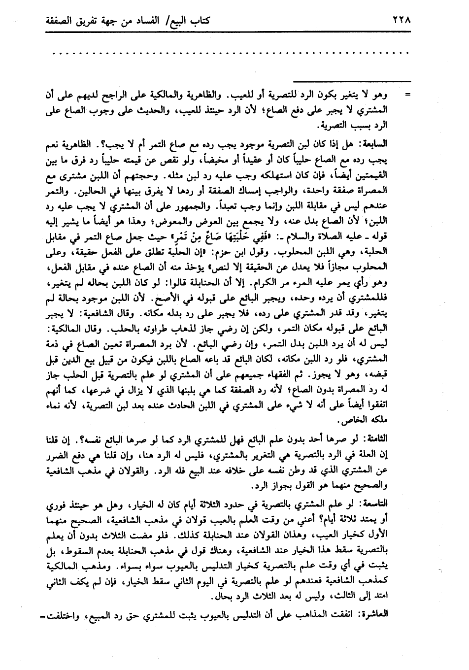السابعة: هل إذا كان لبن التصرية موجود يجب رده مع صاع التمر أم لا يجب؟. الظاهرية نعم يجب رده مع الصاع حليباً كان أو عقيداً أو مخيضاً، ولو نقص عن قيمته حليباً رد فرق ما بين القيمتين أيضاً، فإن كان استهلكه وجب عليه رد لبن مثله. وحجتهم أن اللبن مشترى مع المصراة صفقة واحدة، والواجب إمساك الصفقة أو ردها لا يفرق بينها في الحالين. والتمر عندهم ليس في مقابلة اللبن وإنما وجب تعبداً. والجمهور على أن المشتري لا يجب عليه رد اللبن؛ لأن الصاع بدل عنه، ولا يجمع بين العوض والمعوض؛ وهذا هو أيضاً ما يشير إليه قوله -عليه الصلاة والسلام-: "فَفِي حَلْبَتِهَا صَاعٌ مِنْ تَمْرٍ" حيث جعل صاع التمر في مقابل الحلبة، وهي اللبن المحلوب. وقول ابن حزم: "إن الحلبة تطلق على الفعل حقيقة، وعلى المحلوب مجازاً فلا يعدل عن الحقيقة إلا لنص" يؤخذ منه أن الصاع عنده في مقابل الفعل، وهو رأي يمر عليه المرء مر الكرام. إلا أن الحنابلة قالوا: لو كان اللبن بحاله لم يتغير، فللمشتري أن يرده وحده، ويجبر البائع على قبوله في الأصح. لأن اللبن موجود بحالة لم يتغير، وقد قدر المشتري على رده، فلا يجبر على رد بدله مكانه. وقال الشافعية: لا يجبر البائع على قبوله مكان التمر، ولكن إن رضي جاز لذهاب طراوته بالحلب. وقال المالكية: ليس له أن يرد اللبن بدل التمر، وإن رضي البائع. لأن برد المصراة تعين الصاع في ذمة المشتري، فلو رد اللبن مكانه، لكان البائع قد باعه الصاع باللبن فيكون من قبيل بيع الدين قبل قبضه، وهو لا يجوز. ثم الفقهاء جميعهم على أن المشتري لو علم بالتصرية قبل الحلب جاز له رد المصراة بدون البيع؛ لأنه رد الصفقة كما هي بلبنها الذي لا يزال في ضرعها، كما أنهم أتفقوا أيضاً على أنه لا شيء على المشتري في اللبن الحادث عنده بعد لبن التصرية، لأنه نماء ملكه الخاص.