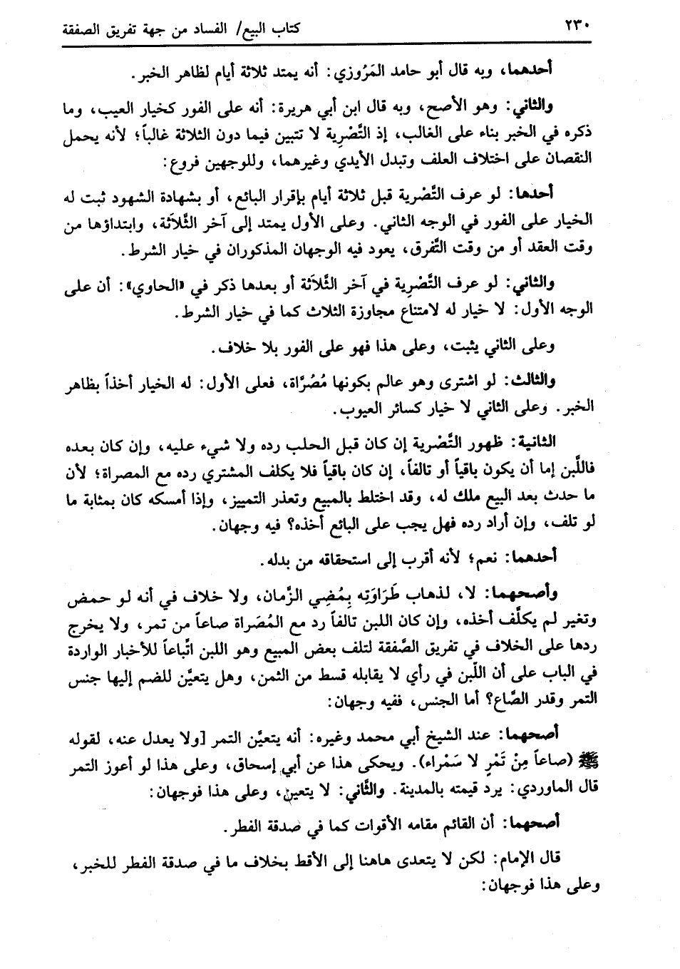 وأصحهما: لا، لذهاب طَرَاوَتِه بِمُضِي الزَّمان، ولا خلاف في أنه لو حمض وتغير لم يكلَّف أخذه، وإن كان اللبن تالفاً رد مع المُصَراة صاعاً من تمر، ولا يخرج ردها على الخلاف في تفريق الصَّفقة لتلف بعض المبيع وهو اللبن اتِّباعاً للأخبار الواردة في الباب على أن اللّبن في رأي لا يقابله قسط من الثمن، وهل يتعيَّن للضم إليها جنس التمر وقدر الصَّاع؟ أما الجنس، ففيه وجهان: