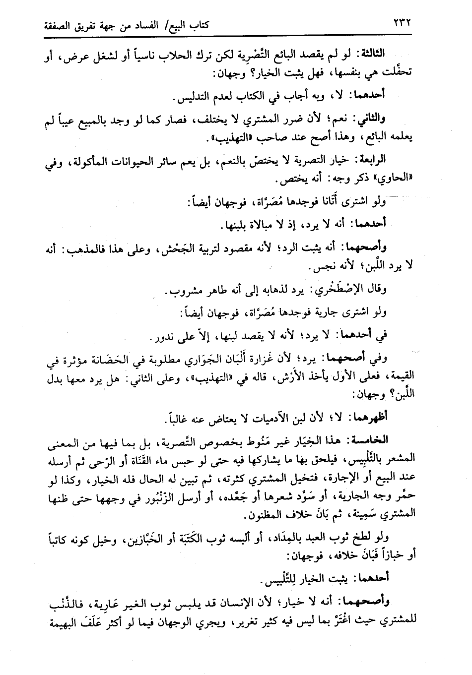 الخامسة: هذا الخِيَار غير مَنُوط بخصوص التَّصرية، بل بما فيها من المعنى المشعر بالتَّلْبِيس، فيلحق بها ما يشاركها فيه حتى لو حبس ماء القَنَاة أو الرّحى ثم أرسله عند البيع أوَ الإجارة، فتخيل المشتري كثرته، ثم تبين له الحال فله الخيار، وكذا لو حمَّر وجه الجارية، أو سَوَّد شعرها أو جَعَّده، أو أرسل الزّنْبُور في وجهها حتى ظنها المشتري سَمِينة، ثم بَانَ خلاف المظنون.