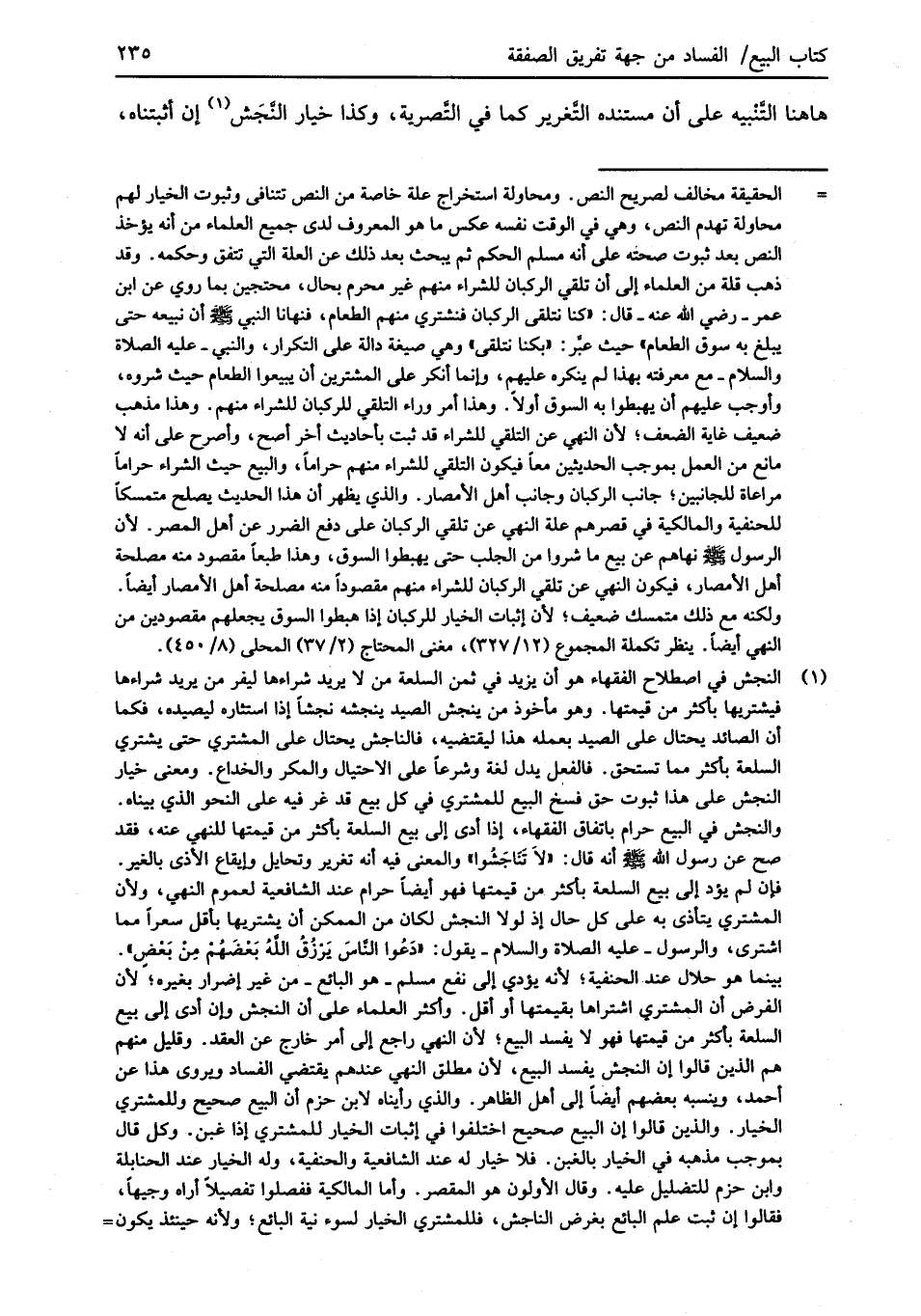 = الحقيقة مخالف لصريح النص. ومحاولة استخراج علة خاصة من النص تتنافى وثبوت الخيار لهم محاولة تهدم النص، وهي في الوقت نفسه عكس ما هو المعروف لدى جميع العلماء من أنه يؤخذ النص بعد ثبوت صحته على أنه مسلم الحكم ثم يبحث بعد ذلك عن العلة التي تتفق وحكمه. وقد ذهب قلة من العلماء إلى أن تلقي الركبان للشراء منهم غير محرم بحال، محتجين بما روي عن ابن عمر -رضي الله عنه- قال: "كنا نتلقى الركبان فنشتري منهم الطعام، فنهانا النبي -صلى الله عليه وسلم- أن نبيعه حتى يبلغ به سوق الطعام" حيث عبَّر: "بكنا نتلقى" وهي صيغة دالة على التكرار، والنبي -عليه الصلاة والسلام- مع معرفته بهذا لم ينكره عليهم، وإنما أنكر على المشترين أن يبيعوا الطعام حيث شروه، وأوجب عليهم أن يهبطوا به السوق أولاً. وهذا أمر وراء التلقي للركبان للشراء منهم. وهذا مذهب ضعيف غاية الضعف؛ لأن النهي عن التلقي للشراء قد ثبت بأحاديث أخر أصح، وأصرح على أنه لا مانع من العمل بموجب الحديثين معاً فيكون التلقي للشراء منهم حراماً، والبيع حيث الشراء حراماً مراعاة للجانبين؛ جانب الركبان وجانب أهل الأمصار. والذي يظهر أن هذا الحديث يصلح متمسكاً للحنفية والمالكية في قصرهم علة النهي عن تلقي الركبان على دفع الضرر عن أهل المصر. لأن الرسول -صلى الله عليه وسلم- نهاهم عن بيع ما شروا من الجلب حتى يهبطوا السوق، وهذا طبعاً مقصود منه مصلحة أهل الأمصار، فيكون النهي عن تلقي الركبان للشراء منهم مقصوداً منه مصلحة أهل الأمصار أيضاً. ولكنه مع ذلك متمسك ضعيف؛ لأن إثبات الخيار للركبان إذا هبطوا السوق يجعلهم مقصودين من النهي، أيضاً. ينظر تكملة المجموع (12/ 327)، مغنى المحتاج (2/ 37) المحلى (8/ 450).