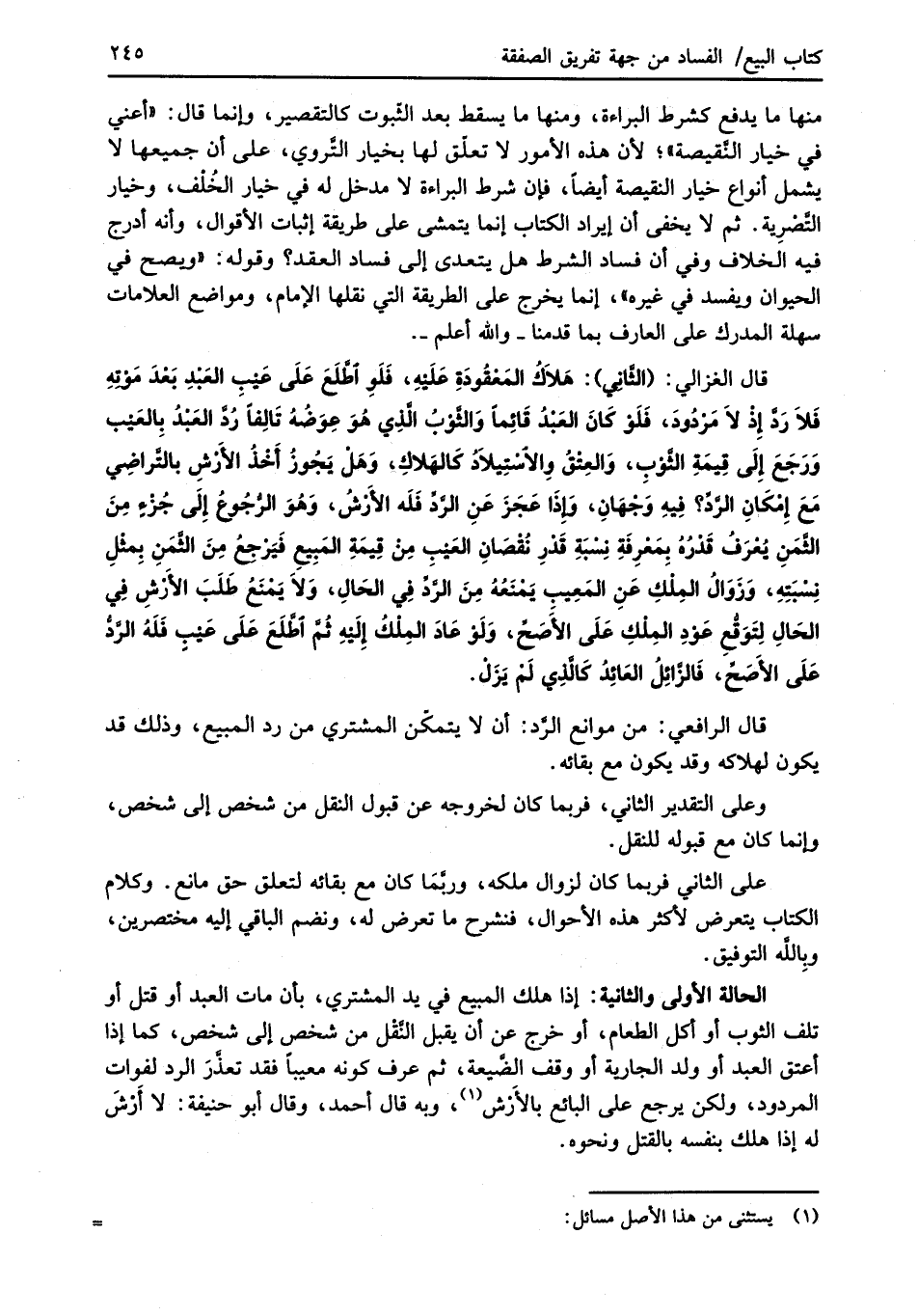 قال الغزالي: (الثَّانِي): هَلاَكُ المَعْقُودَةِ عَلَيْهِ، فَلَوِ اطَّلَعَ عَلَى عَيْبِ العَبْدِ بَعْدَ مَوْتِهِ فَلاَ رَدَّ إِذْ لاَ مَرْدُودَ، فلَوْ كَانَ العَبْدُ قَائِماً وَالثَّوْبُ الَّذِي هُو عِوَضُهُ تَالِفاً رُدَّ العَبْدُ بِالعَيْب وَرَجَعَ إِلَى قِيمَةِ الثَّوْبِ، وَالعِتْقُ وِالاسْتِيلاَدُ كَالهَلاكِ، وَهَل يَجُوزُ أَخْذُ الأَرْشِ بالتَّراضِي مَعَ إِمْكَانِ الرَّدِّ؟ فِيهِ وَجْهَانِ، وإذَا عَجَزَ عَنِ الرَّدِّ فَلَه الأَرْشُ، وَهوَ الرُّجُوعُ إلَى جُزْءٍ مِنَ الثَّمَنِ يُعْرَفُ قَدْرُهُ بِمَعَرِفَةِ نِسْبَةِ قَدْرِ نُقْصَانِ العَيْبِ مِنْ قِيمَةِ المَبِيعِ فَيَرْجِعُ مِنَ الثَّمَنِ بِمثْلِ نِسْبَتِهِ، وَزَوَالُ المِلْكِ عَنِ المَعِيب يَمْنَعُهُ مِنَ الرَّدِّ فِي الحَالِ، وَلاَ يَمْنَعُ طَلَبَ الأَرْشِ فِي الحَالِ لِتَوَقُّعِ عَوْدِ المِلْكِ عَلَى الأًصَحِّ، وَلَوْ عَادَ المِلْكُ إِلَيْهِ ثُمَّ أطَّلَعَ عَلَى عَيْبٍ فلَهُ الرَّدُّ عَلَى الأَصَحِّ، فالزَّائِلُ العَائِدُ كَالَّذِي لَمْ يَزَلْ.