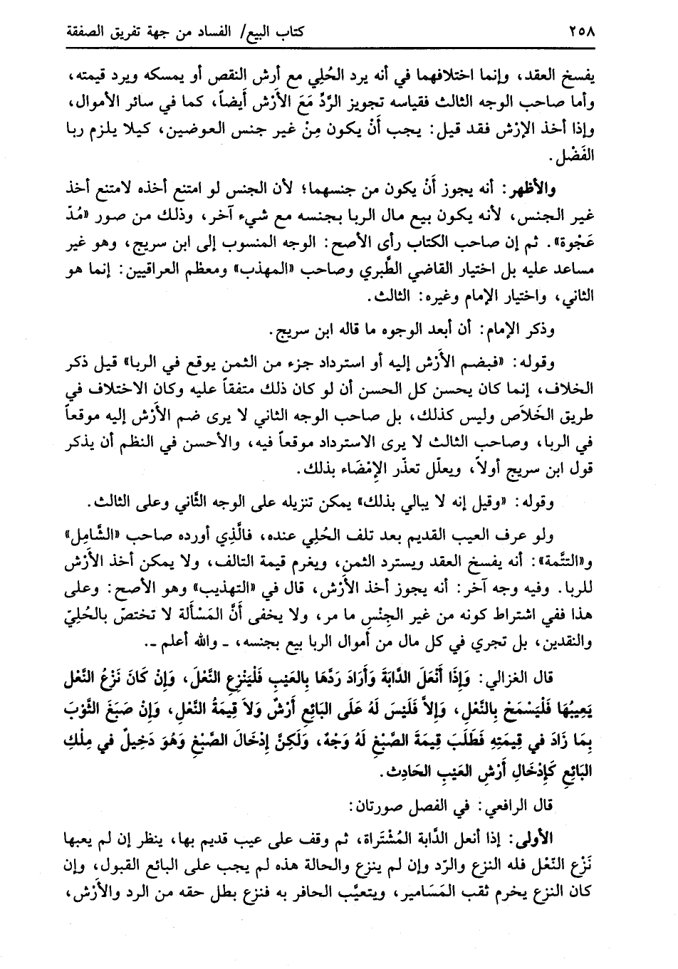 وقوله: "فبضم الأَرْش إليه أو استرداد جزء من الثمن يوقع في الربا" قيل ذكر الخلاف، إنما كان يحسن كل الحسن أن لو كان ذلك متفقاً عليه وكان الاختلاف في طريق الخَلاَص وليس كذلك، بل صاحب الوجه الثاني لا يرى ضم الأَرْش إليه موقعًا في الربا، وصاحب الثالث لا يرى الاسترداد موقعًا فيه، والأحسن في النظم أن يذكر قول ابن سريج أولاً، ويعلل تعذر الإِمْضَاء بذلك.