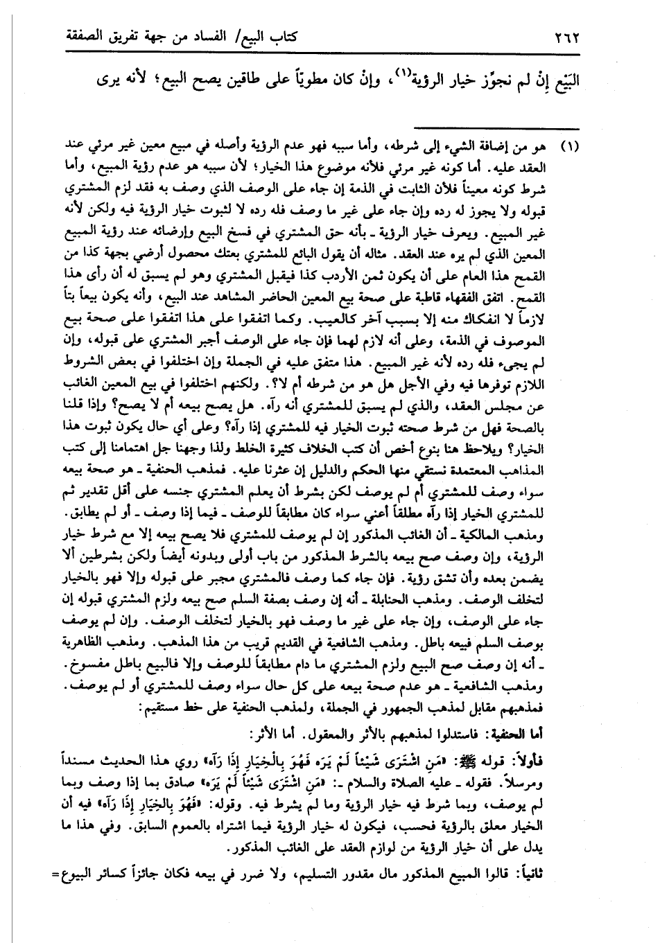 (¬1) هو من إضافة الشيء إلى شرطه، وأما سببه فهو عدم الرؤية وأصله في مبيع معين غير مرئي عند العقد عليه. أما كونه غير مرئي فلأنه موضوع هذا الخيار؛ لأن سببه هو عدم رؤية المبيع، وأما شرط كونه معيناً فلأن الثابت في الذمة إن جاء على الوصف الذي وصف به فقد لزم المشتري قبوله ولا يجوز له رده وإن جاء على غير ما وصف فله رده لا لثبوت خيار الرؤية فيه ولكن لأنه غير المبيع. ويعرف خيار الرؤية -بأنه حق المشتري في فسخ البيع وإرضائه عند رؤية المبيع المعين الذي لم يكره عند العقد. مثاله أن يقول البائع للمشتري بعتك محصول أرضي بجهة كذا من القمح هذا العام على أن يكون ثمن الأردب كذا فيقبل المشتري وهو لم يسبق له أن رأى هذا القمح. اتفق الفقهاء قاطبة على صحة بيع المعين الحاضر المشاهد عند البيع، وأنه يكون بيعاً بتاً لازماً لا انفكاك منه إلا بسبب آخر كالعيب. وكما اتفقوا على هذا اتفقوا على صحة بيع الموصوف في الذمة، وعلى أنه لازم لهما فإن جاء على الوصف أجبر المشتري على قبوله، وإن لم يجئ فله رده لأنه غير المبيع. هذا متفق عليه في الجملة وإن اختلفوا في بعض الشروط اللازم توفرها فيه وفي الأجل هل هو من شرطه أم لا؟. ولكنهم اختلفوا في بيع المعين الغائب عن مجلس العقد، والذي لم يسبق للمشتري أنه رآه. هل يصح بيعه أم لا يصح؟ وإذا قلنا بالصحة فهل من شرط صحته ثبوت الخيار فيه للمشتري إذا رآه؟ وعلى أي حال يكون ثبوت هذا الخيار؟ ويلاحظ هنا بنوع أخص أن حب الخلاف كثيرة الخلط ولذا وجهنا جل اهتمامنا إلى كتب المذاهب المعتمدة نستقي منها الحكم والدليل إن عثرنا عليه. فمذهب الحنفية -هو صحة بيعه سواء وصف للمشتري أم لم يوصف لكن بشرط أن يعلم المشتري جنسه على أقل تقدير ثم للمشري الخيار إذا رآه مطلقاً أعني سواء كان مطابقاً للوصف -فيما إذا وصف- أو لم يطابق. ومذهب المالكية -أن الغائب المذكور إن لم يوصف للمشتري فلا يصح بيعه إلا مع شرط خيار الرؤية، وإن وصف صح بيعه بالشرط المذكور من باب أولى وبدونه أيضاً ولكن بشرطين ألا يضمن بعده وأن تشق رؤية. فإن جاء كما وصف فالمشتري مجبر على قبوله وإلا فهو بالخيار لتخلف الوصف. ومذهب الحنابلة -أنه إن وصف بصفة السلم صح بيعه ولزم المشتري قبوله إن جاء على الوصف، وإن جاء على غير ما وصف فهو بالخيار لتخلف الوصف. وإن لم يوصف بوصف السلم فبيعه باطل. ومذهب الشافعية في القديم قريب من هذا المذهب. ومذهب الظاهرية- أنه إن وصف صح البيع ولزم المشتري ما دام مطابقاً للوصف وإلا فالبيع باطل مفسوخ. ومذهب الشافعية -هو عدم صحة بيعه على كل حال سواء وصف للمشتري أو لم يوصف. فمذهبهم مقابل لمذهب الجمهور في الجملة، ولمذهب الحنفية على خط مستقيم: