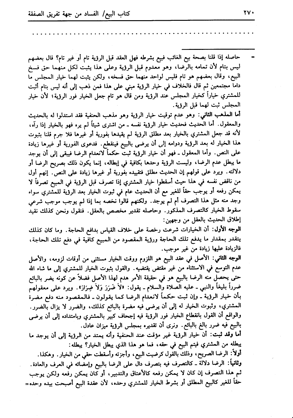 أما المذهب الثاني: وهو عدم توقيت خيار الرؤية وهو مذهب الحنفية فقد استدلوا له بالحديث والمعقول. أما الحديث فحديث خيار الرؤية نفسه -من اشترى شيئاً لم يكره فهو بالخيار إذا رآه، لأنه قد جعل المشتري بالخيار بعد مطلق الرؤية لم يقيدها بفورية أو غيرها فلا جرم قلنا بثبوت هذا الخيار له بعد الرؤية ودوامه إلى أن يرضى بالبيع فينقطع. فدعوى الفورية أو غيرها زيادة على النص. وأما المعقول -فهو أن خيار الرؤية ثبت حكماً لانعدام الرضا فيبقى إلى أن يوجد ما يبطل عدم الرضا، وليست الرؤية وحدها بكافية في إبطاله، إنما يكون ذلك بصريح الرضا أو دلالته. ويرد على قولهم إن الحديث مطلق فتقييده بفورية أو غيرها زيادة على النص. إنهم أول من ناقض نفسه في هذا حيث أسقطوا خيار المشتري إذا تصرف قبل الرؤية في المبيع تصرفاً لا يمكن رفعه أو يوجب حقاً للغير مع أن الحديث عام في ثبوت الخيار بعد الرؤية للمشتري سواء وجد منه مثل هذا التصرف أم لم يوجد. ولكنهم قالوا نخصه بما إذا لم يوجب موجب شرعي سقوط الخيار كالتصرف المذكور. وحاصله تقدير مخصص بالعقل. فنقول ونحن كذلك نقيد إطلاق الحديث بالعقل من وجهين: