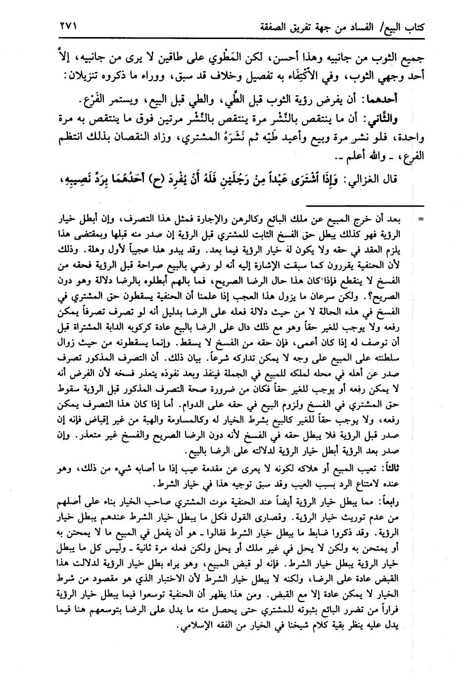 = بعد أن خرج المبيع عن ملك البائع وكالرهن والإجارة فمثل هذا التصرف، وإن أبطل خيار الرؤية فهو كذلك يبطل حق الفسخ الثابت للمشتري قبل الرؤية إن صدر منه قبلها وبمقتضى هذا يلزم العقد في حقه ولا يكون له خيار الرؤية فيما بعد. وقد يبدو هذا عجيبًا لأول وهلة. وذلك لأن الحنفية يقررون كما سبقت الإشارة إليه أنه لو رضي بالبيع صراحة قبل الرؤية فحقه من الفسخ لا ينقطع فإذا كان هذا حال الرضا الصريح، فما بالهم أبطلوه بالرضا دلالة وهو دون الصريح؟. ولكن سرعان ما يزول هذا العجب إذا علمنا أن الحنفية يسقطون حق المشتري في الفسخ في هذه الحالة لا من حيث دلالة فعله على الرضا بدليل أنه لو تصرف تصرفاً يمكن رفعه ولا يوجب للغير حقاً وهو مع ذلك دال على الرضا بالبيع عادة كركوبه الدابة المشتراة قبل أن توصف له إذا كان أعمى، فإن حقه من الفسخ لا يسقط. وإنما يسقطونه من حيث زوال سلطنته على المبيع على وجه لا يمكن تداركه شرعاً. بيان ذلك. أن التصرف المذكور تصرف صدر عن أهله في محله لملكه للمبيع في الجملة فينفذ وبعد نفوذه يتعذر فسخه لأن الفرض أنه لا يمكن رفعه أو يوجب للغير حقاً فكان من ضرورة صحة التصرف المذكور قبل الرؤية سقوط حق المشتري في الفسخ ولزوم البيع في حقه على الدوام. أما إذا كان هذا التصرف يمكن رفعه، ولا يوجب حقاً للغير كالبيع بشرط الخيار له وكالمساومة والهبة من غير إقباض فإنه إن صدر قبل الرؤية فلا يبطل حقه في الفسخ لأنه دون الرضا الصريح والفسخ غير متعذر. وإن صدر بعد الرؤية أبطل خيار الرؤية لدلالته على الرضا بالبيع.