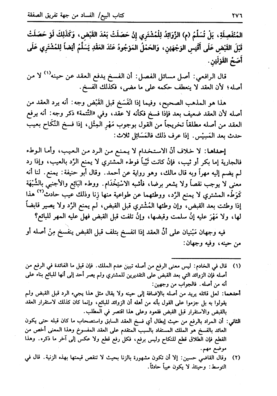 (¬1) قال في الخادم: ليس معنى الرفع من أصله تبين عدم الملك. فإن قيل ما الفائدة في الرفع من أصله فإن الزوائد التي بعد القبض على التقديرين للمشتري ولم يصر أحد إلى أنها للبائع بناء على أنه من أصله. فالجواب من وجهين: