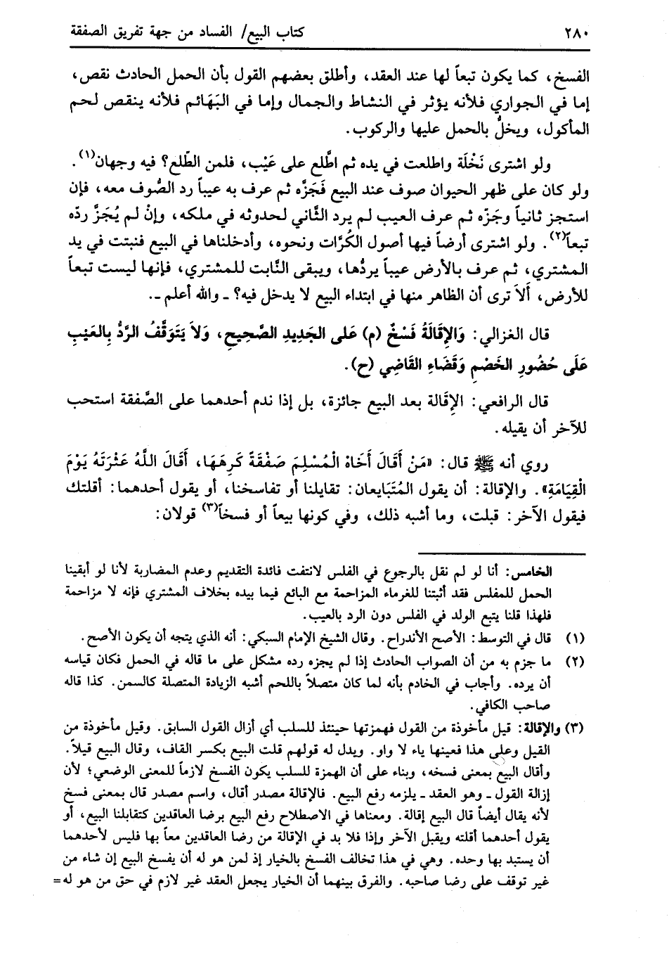 قال الغزالي: وَالإقَالَةُ فَسْخٌ (م) عَلى الجَدِيدِ الصَّحِيحِ، وَلاَ يَتَوَقَّفُ الرَّدُّ بِالعَيْبِ عَلَى حُضُورِ الخَصْمِ وَقَضَاءِ القَاضِي (ح).