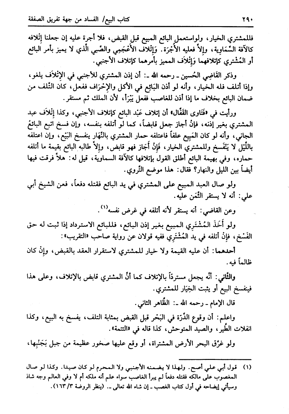 ورأيت في "فَتَاوى القَفَّال" أن إتلاف عَبْد البائع كإتلاف الأجنبي، وكذا إِتْلاَف عبد المشتري بغير إذنه، فإن أجاز جعل قابضاً، كما لو أتلفه بنفسه، وإن فسخ اتبع البائعُ الجاني، وأنه لو كان المَبِيع علفاً فاعتلفه حمار المشتري بالنَّهَار ينفسخ البَيْع، وإن اعتلفه باللَّيْل لا يَنْفَسخ وللمشتري الخيار، فَإِنْ أَجَاز فهو قابض، وإلاَّ طالبه البائع بقيمة ما أتلفه حماره، وفي بهيمة البائع أطلق القول بإتلافها كالآفة السماوية، قيل له: هلاَّ فرقت فيها أيضاً بين الليل والنهار؟ فقال: هذا موضع التَّروي.