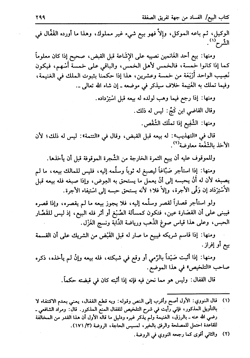ومنها: بيع أحد الغَانمين نصيبه على الإشَاعة قبل القبض، صحيح إذا كان معلوماً كما إذا كانوا خمسة، فالخمس لأهل الخمس، والباقي على خمسة أَسْهم، فيكون نَصِيب الواحد أَرْبَعَة من خمسة وعشرين، هذا إذا حكمنا بثبوت الملك في الغنيمة، وفيما تملك به الغَنِيمة خلاف سيذكر في موضعه -إن شاء الله تعالى-.