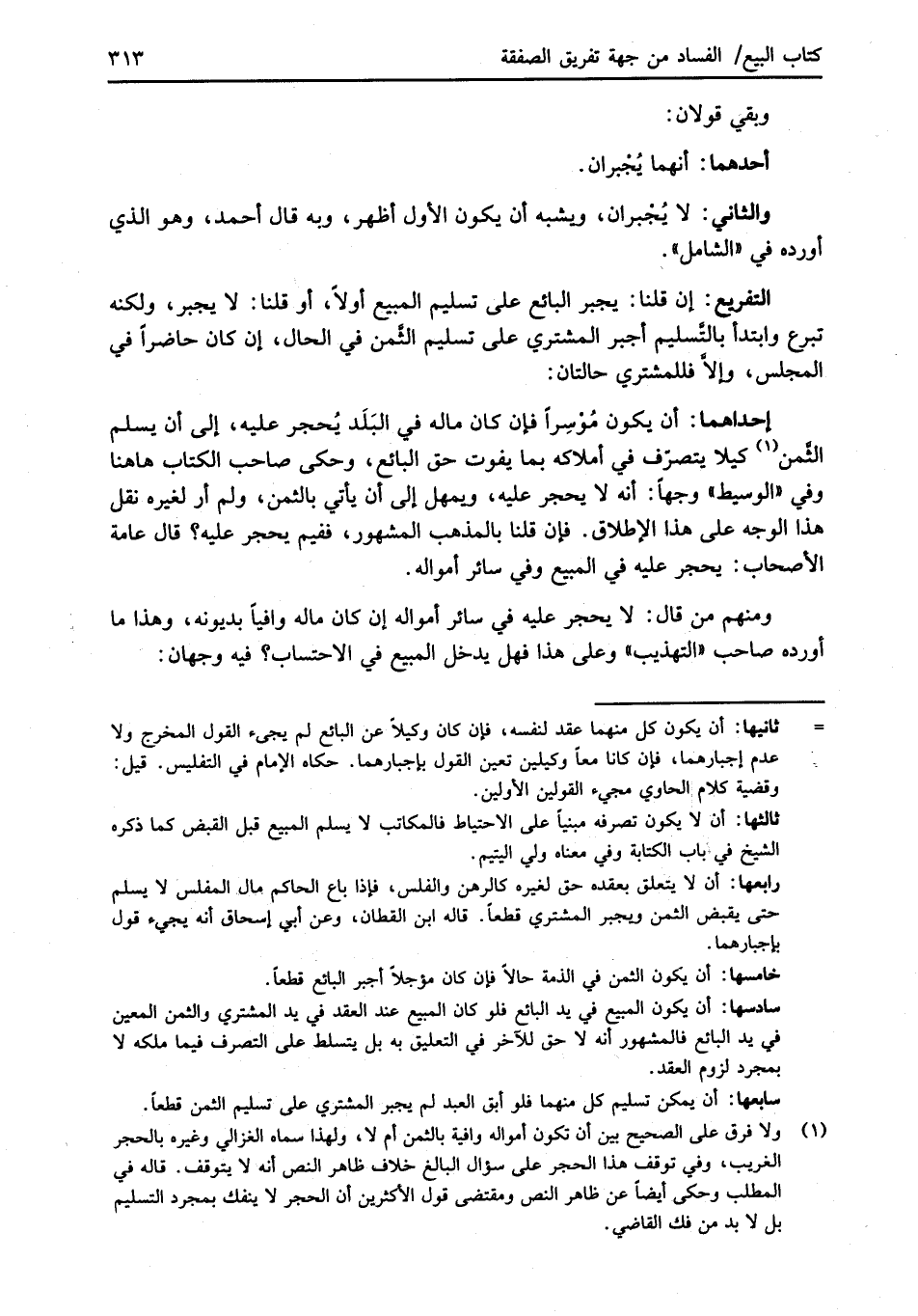 (¬1) ولا فرق على الصحيح بين أن تكون أمواله وافية بالثمن أم لا، ولهذا سماه الغزالي وغيره بالحجر الغريب، وفي توقف هذا الحجر على سؤال البالغ خلاف ظاهر النص أنه لا يتوقف. قاله في المطلب وحكى أيضاً عن ظاهر النص ومقتضى قول الأكثرين أن الحجر لا ينفك بمجرد التسليم بل لا بد من فك القاضي.