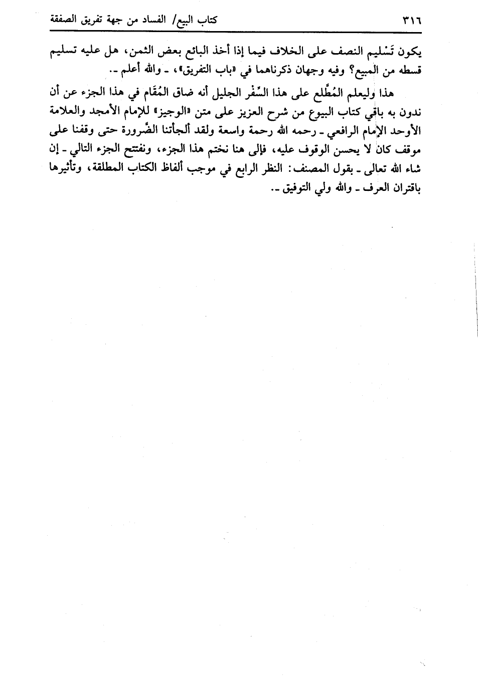 هذا وليعلم المُطَّلع على هذا السِّفْر الجليل أنه ضاق المُقَام في هذا الجزء عن أن ندون به باقْي كتاب البيوع من شرح العزيز على متن "الوجيز" للإمام الأمجد والعلامة الأوحد الإمام الرافعي -رحمه الله رحمة واسعة ولقد ألجأتنا الضَّرورة حتى وقفنا على موقف كان لا يحسن الوقوف عليه، فإلى هنا نختم هذا الجزء، ونفتتح الجزء التالي -إن شاء الله تعالى- بقول المصنف: النظر الرابع في موجب ألفاظ الكتاب المطلقة، وتأثيرها باقتران العرف -والله ولي التوفيق-.