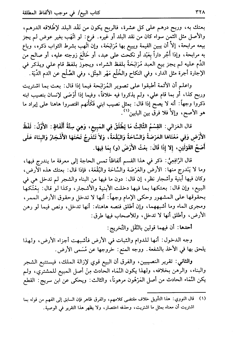 قال الغزالي: القِسْمُ الثَّالِثُ مَا يُطْلَقُ فِي المَبِيعِ، وَهِيَ سِتَّةُ أَلْفَاظٍ: الأَوَّلُ: لَفْظُ الأَرْضِ وَفِي مَعْنَاهَا العَرْصَةُ وَالسَّاحَةُ وَالبُقْعَةُ، وَلاَ تَنْدَرجُ تَحْتَهَا الأَشْجَارُ وَالبِنَاءُ عَلَى أَصَحِّ القَوْلَيْنِ، إِلا إِذَا قَالَ: بعْتُ الأَرْضَ (و) بِمَا فِيهَا.