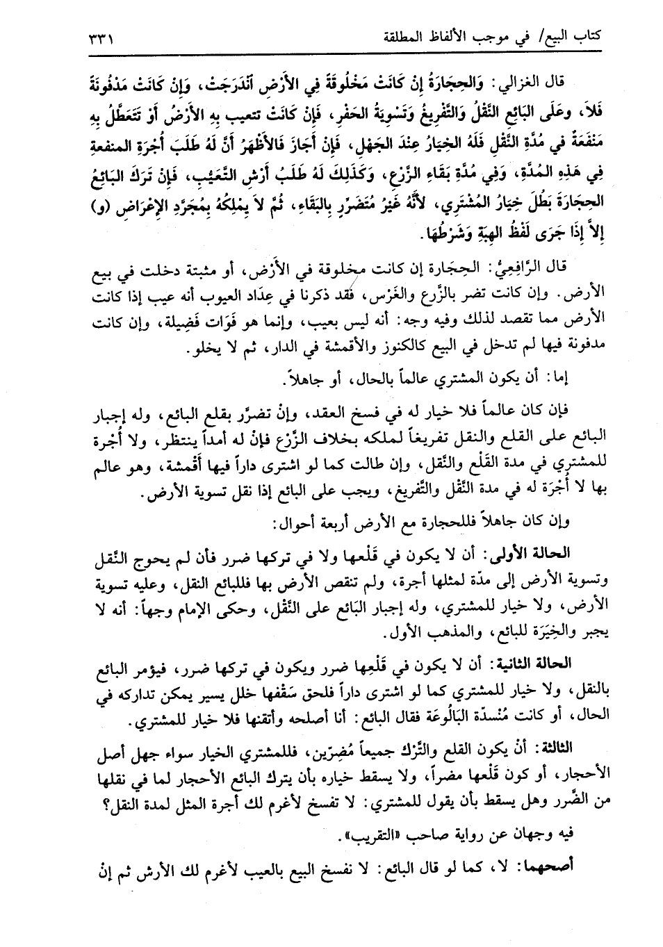 قال الغزالي: وَالحِجَارَةُ إنْ كَانَتْ مَخْلُوقَةَ فِي الأَرْضِ انْدَرَجَتْ، وَإِنْ كَانَتْ مَدْفُونَةً فَلاَ، وعَلَى البَائِعِ النَّقْلُ وَالتَّفْرِيغُ وَتَسْوِيَةُ الحَفْرِ، فَإِنْ كَانَتْ تتعيب بِهِ الأَرْضُ أَوْ تَتَعَطَّلُ بِهِ مَنْفَعَةٌ في مُدَّةِ النَّقْلِ فَلَهُ الخِيَارُ عِنْدَ الجَهْلِ، فَإِنْ أَجَازَ فَالأَظْهَرُ أَنَّ لَهُ طَلَبَ أُجْرَةِ المنفعةِ فِي هَذِهِ المُدَّةِ، وَفِي مُدَّةِ بَقَاءِ الزَّرْعِ، وَكَذَلِكَ لَهُ طَلَبُ أَرْشِ التَّعَيُّبِ، فَإِنْ تَرَكَ البَائِعُ الحِجَارَةَ بَطُلَ خِيَارُ المُشْتَرِي، لأَنَّهُ غَيْرُ مُتَضَرِّرِ بِالبَقَاءِ، ثُمَّ لاَ يِمْلِكُهُ بِمُجَرَّدِ الأِعْرَاضِ (و) إِلاَّ إِذَا جَرَى لَفْظُ الهِبَةِ وَشَرْطُهَا.