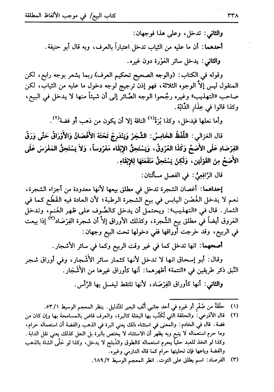 قال الغزالي: اللَّفْظُ الخَامِسُ: الشَّجَرُ وَيَنْدَرج تَحْتَهُ الأَغْصَانُ وَالأَوْرَاقُ حَتَّى وَرَقُ الفِرْصَادِ عَلَى الأَصَحِّ وَكذَا العُرُوقُ، وَيسْتَحِقُّ الإِبْقَاء مَغَرُوساً، وَلاَ يَسْتَحِقُّ المَغْرَسَ عَلَى الأَصَحِّ مِنَ القَوْلَيْن، وَلَكنْ يَسْتَحِقُّ مَنْفَعَتَهَا لِلإِبْقَاءِ.