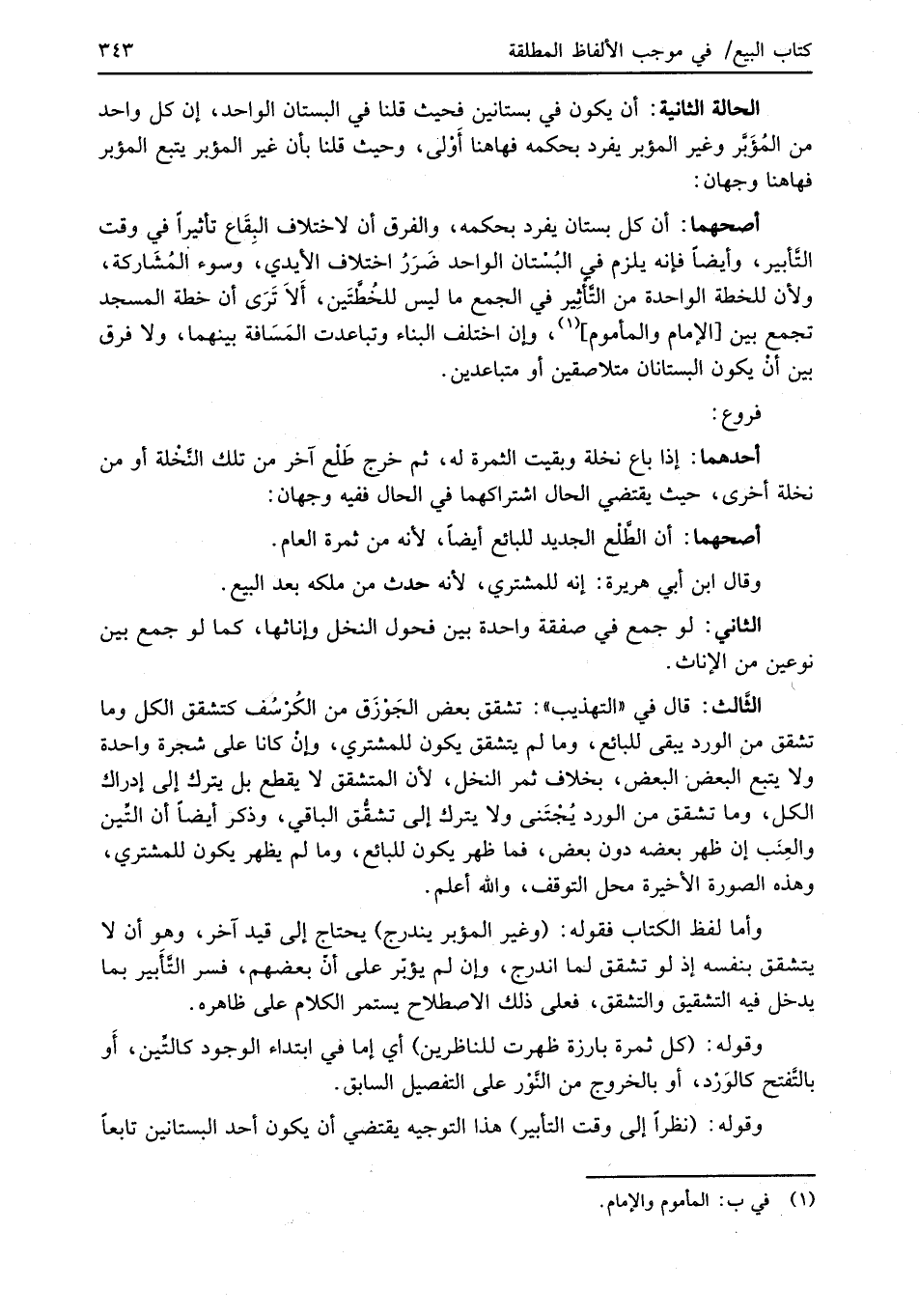 الحالة الثانية: أن يكون في بستانين فحيث قلنا في البستان الواحد، إن كل واحد من المُؤَبَّر وغير المؤبر يفرد بحكمه فهاهنا أَوْلى، وحيث قلنا بأن غير المؤبر يتبع المؤبر فهاهنا وجهان: