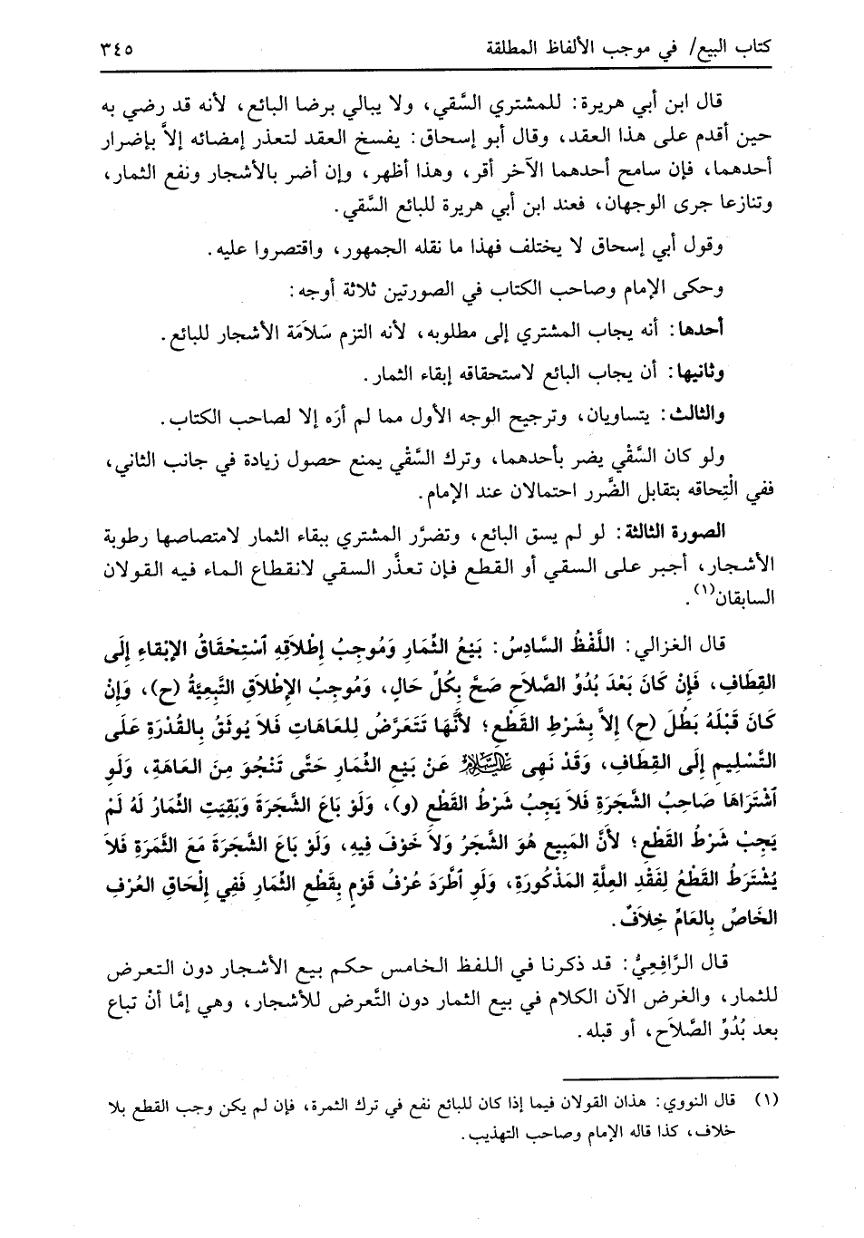قال الغزالي: اللَّفْظُ السَّادِسُ: بَيْعُ الثِّمَارِ وَمُوجِبُ إِطْلاَقِهِ اسْتِحْقَاقُ الإبْقاءِ إِلَى القِطَاف، فَإنْ كَانَ بَعْدَ بُدُوِّ الصَّلاحَ صَحَّ بِكُلِّ حَالٍ، وَمُوجِبُ الإِطْلاَقِ التَّبِعِيَّةُ (ح)، وَإنْ كَانَ قَبْلَهُ بَطُلَ (ح) إلاَّ بِشَرْطِ القَطْعِ؛ لأَنَّهَا تَتَعَرَّضُ لِلعَاهَاتِ فَلاَ يُوثَقُ بِالقُدْرَةِ عَلَى التَّسْلِيمِ إِلَى القِطَاف، وَقَدْ نَهِى عليه السلام عَنْ بَيْعِ الثِّمَارِ حَتَّى تَنْجُوَ مِنَ العَاهَةِ، وَلَوِ اشْتَرَاهَا صَاحِبُ الشَّجَرَةِ فَلاَ يَجِبُ شَرْطُ القَطْعِ (و)، وَلَوْ بَاعَ الشَّجَرَةَ وَبَقِيَتِ الثِّمَارُ لَهُ لَمْ يَجِبْ شَرْطُ القَطْعِ؛ لأَنَّ المَبِيع هُوَ الشَّجَرُ وَلاَ خَوْفَ فِيهِ، وَلَوْ بَاعَ الشَّجَرَةَ مَعَ الثَّمَرَةِ فَلاَ يُشْتَرَطُ القَطْعُ لِفَقْدِ العِلَّةِ المَذْكُورَةِ، وَلَوِ اطَّرَدَ عُرْفُ قَوْمٍ بِقَطْعِ الثِّمَارِ فَفِي إِلْحَاقِ العُرْف الخَاصِّ بِالعَامِّ خِلافٌ.