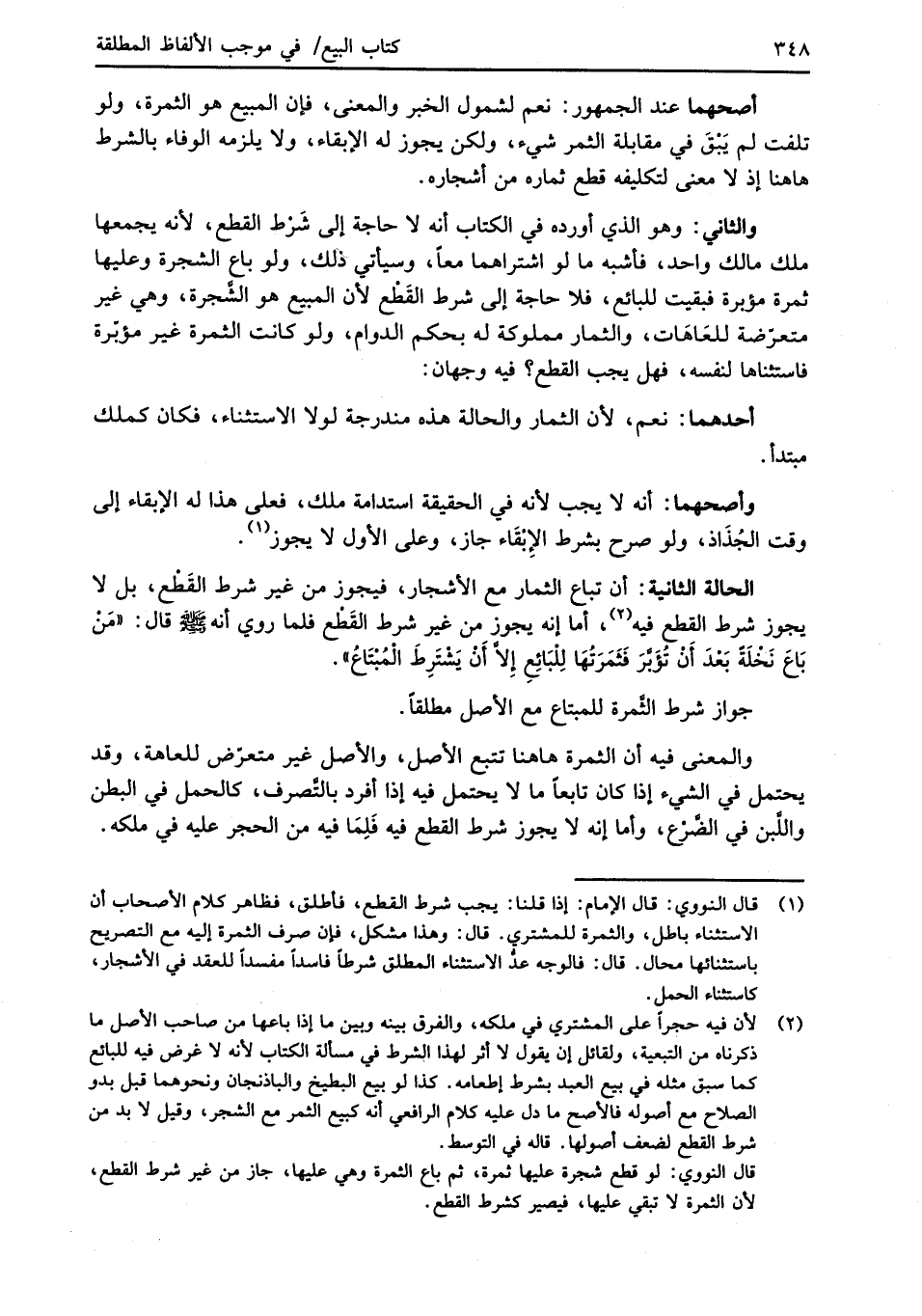 (¬1) قال النووي: قال الإمام: إذا قلنا: يجب شرط القطع، فأطلق، فظاهر كلام الأصحاب أن الاستثناء باطل، والثمرة للمشتري. قال: وهذا مشكل، فإن صرف الثمرة إليه مع التصريح باستثنائها محال. قال: فالوجه عدّ الاستثناء المطلق شرطاً فاسداً مفسداً للعقد في الأشجار، كاستثناء الحمل.