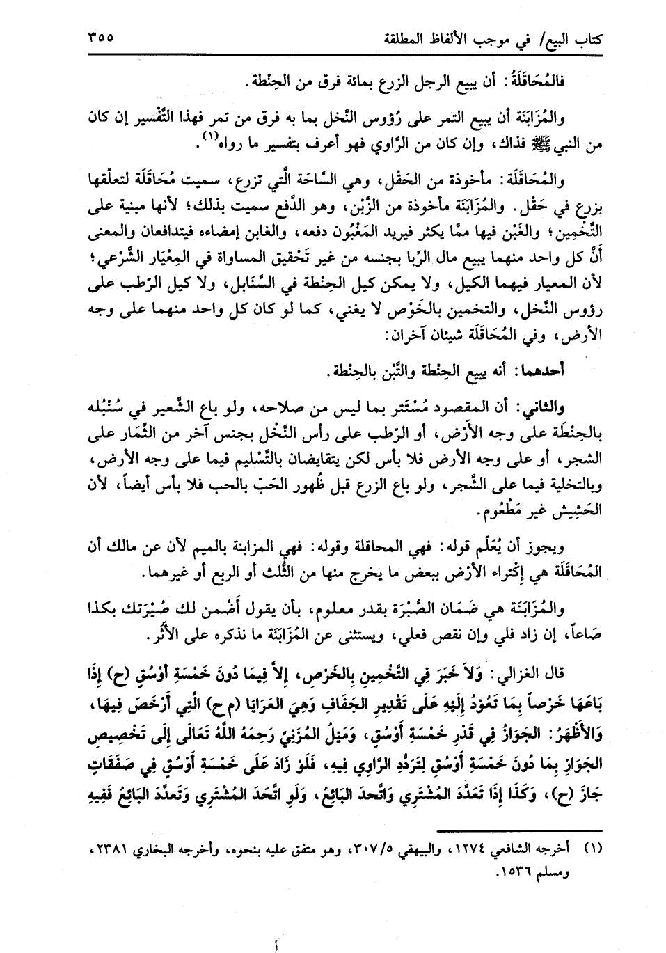 قال الغزالي: وَلاَ خَبَرَ فِي التَّخْمِينِ بِالخَرْصِ، إِلاَّ فِيمَا دُونَ خَمْسَةِ أوْسُقٍ (ح) إِذَا بَاعَهَا خَرْصاً بِمَا تَعُوْدُ إِلَيْهِ عَلَى تَقْدِيرِ الجَفَافِ وَهِيَ العَرَايَا (م ح) الَّتِي أَرْخَصَ فِيهَا، وَالأَظْهَرُ: الجَوَازُ فِي قَدْرِ خَمْسَةِ أَوْسُقٍ، وَمَيْلُ المُزَنِيِّ رَحِمَهُ اللهُ تَعَالَى إِلَى تَخْصِيصِ الجَوَازِ بِمَا دُونَ خَمْسَةِ أَوْسُقِ لِتَرَدُّدِ الرَّاوِي فِيهِ، فَلَوْ زَادَ عَلَى خَمْسَةِ أَوْسُقٍ فِي صَفَقَاتٍ جَازَ (ح)، وَكَذَا إِذَا تَعَدَّدَ المُشْتَرِي وَاتَّحدَ البَائِعُ، وَلَوِ اتَّحَدَ المُشْتَرِي وَتَعدَّدَ البَائِعُ فَفِيهِ