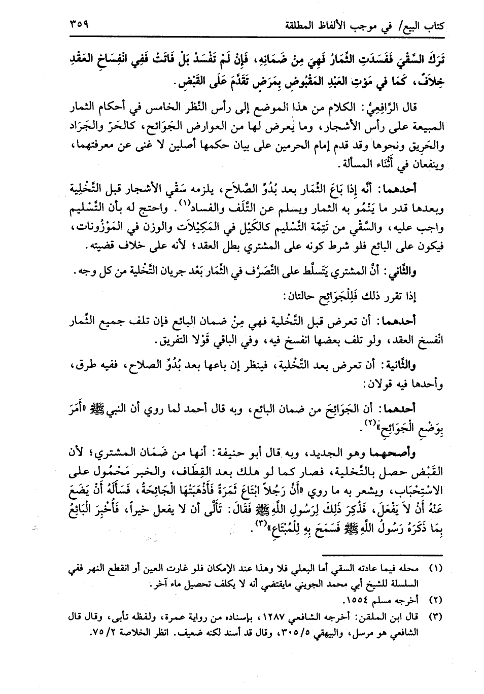 قال الرَّافِعِيُّ: الكلام من هذا الموضع إلى رأس النَّظر الخامس في أحكام الثمار المبيعة على رأس الأشجار، وما يعرض لها من العوارض الجَوَائح، كالحَرّ والجَرَاد والحَرِيق ونحوها وقد قدم إمام الحرمين على بيان حكمها أصلين لا غنى عن معرفتهما، وينفعان في أَثْنَاء المسألة.