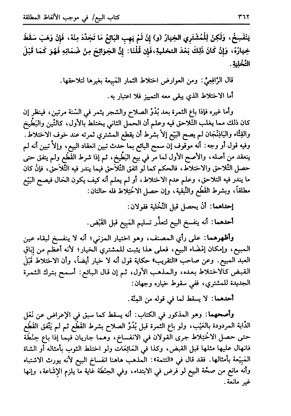 وأصحهما: وهو المذكور في الكتاب: أنه يسقط كما سبق في الإعراض عن نَعْل الدَّابة المردودة بالعَيْب، ولو باع الثمرة قبل بُدُوِّ الصلاح بشرط القَطْع ثم لم يَتَّفق القَطْع حتى حصل الاخْتِلاط جرى القولان في الانفساخ، وهما جاريان فيما إذا باع حِنْطَة فانهال عليها مثلها قبل القبض، وكذا في المَائِعَات ولو اختلط الثوب بأمثاله أو الشاة المَبِيْعة بأمثالها. فقد قال في "التتمة": المذهب هاهنا انفساخ البيع لأنه يورث الاشتباه وأنه مانع من صحَّة البيع لو فرض في الابتداء، وفي الحِنْطَة غاية ما يلزم الإِشَاعة، وإنها غير مانعة.