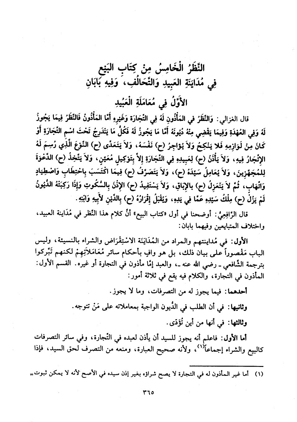 قال الغزالي: وَالنَّظَرُ في المَأْذُونِ لَهُ فِي التِّجَارَة وَغَيْرِهِ أَمَّا المَأْذُونُ فَالنَّظَرُ فِيمَا يَجُوزُ لَهُ وَفِي العُهْدَةِ وَفيمَا يَقْضِي مِنْهُ دُيُونَهُ أَمَّا مَا يَجُوزُ لَهُ فَكُلُّ مَا يَنْدَرجُ تَحْتَ اسْمِ التِّجَارَةِ أَوْ كانَ مِنْ لَوَازِمِهِ فَلا يَنْكِحُ وَلاَ يُؤاجِرُ (ح) نَفْسَهُ، وَلاَ يَتَعَدَّى (ح) النَّوْعَ الَّذِي رُسِمَ لَهُ الإِتِّجَارُ فِيهِ، وَلاَ يَأْذَنُ (ح) لِعَبِيدِهِ فِي التِّجَارَة إلاَّ بِتَوْكيل مُعَيَّنٍ، وَلاَ يَتَّخِذُ (ح) الدَّعْوَةَ لِلمُجَهَّزِينَ، وَلاَ يُعَامِلُ سَيِّدَهُ (ح)، وَلاَ يَتَصَرَّفُ (ح) فِيمَا اكْتَسَبَ بِاحْتِطَابِ وَاصْطِيَاد وَاتِّهَاب، ثُمَّ لاَ يَنْعَزِلُ (ح) بالِإبَاقِ، وَلاَ يَسْتَفِيدُ (ح) الإِذْنَ بِالسُّكُوتِ وَإذَا رَكِبَتْهُ الدُّيُونُ لَمْ يَزُلْ (ح) مِلْكُ سَيِّدِهِ عَمَّا فِي يَدِهِ، وَيُقْبَل إِقْرَارُهُ (ح) بِالدِّيْنِ لأَبِيهِ وَابْنِهِ.