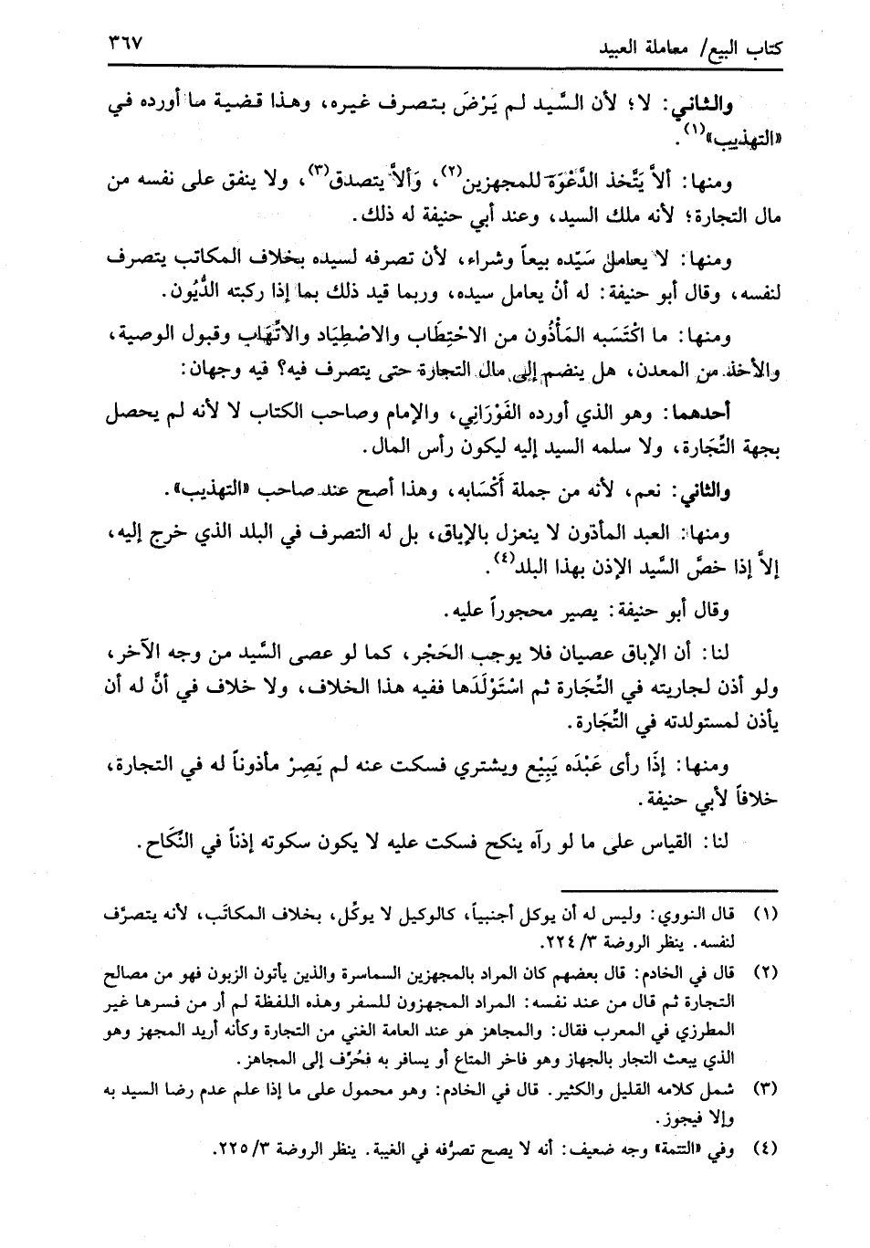 ومنها: لا يعامل سَيّده بيعاً وشراء، لأن تصرفه لسيده بخلاف المكاتب يتصرف لنفسه، وقال أبو حنيفة: له أنْ يعامل سيده، وربما قيد ذلك بما إذا ركبته الدُّيُون.