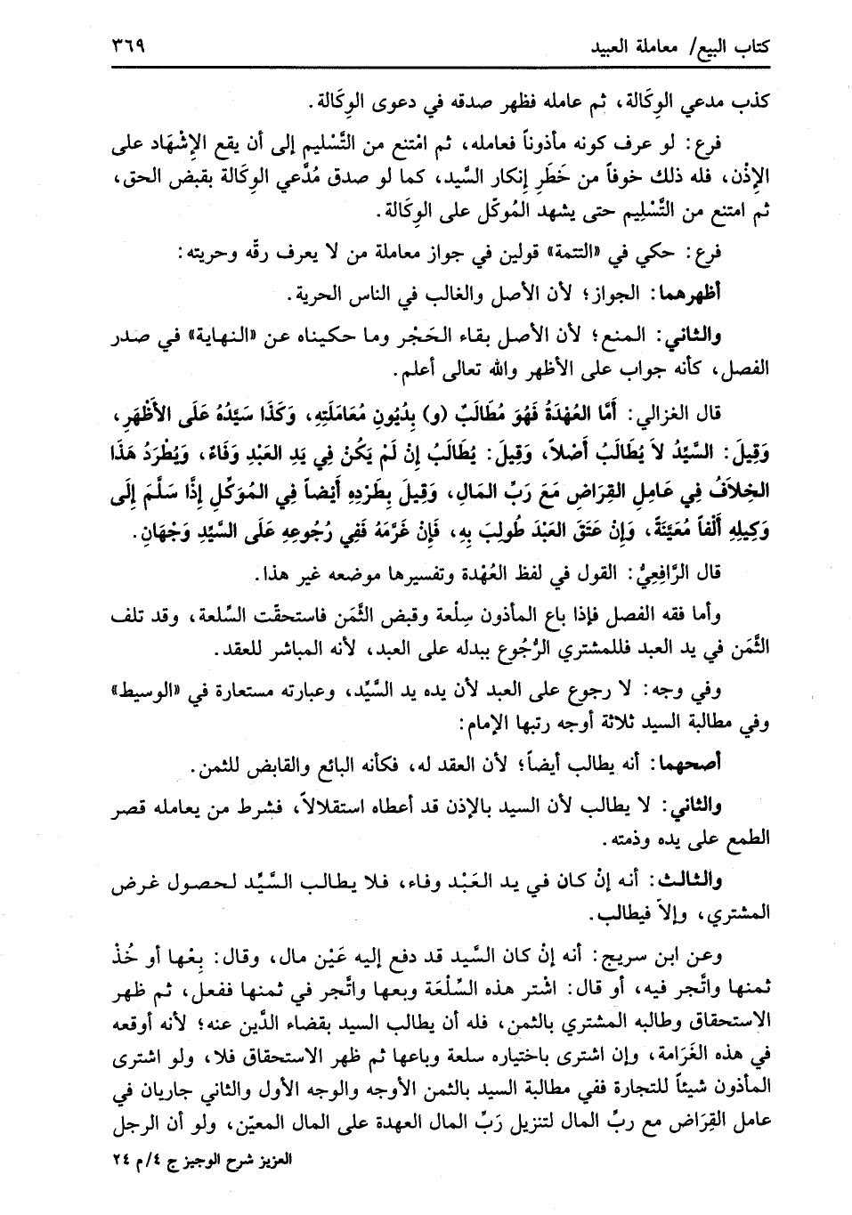 قال الغزالي: أَما العُهْدَةُ فَهُوَ مُطَالَبٌ (و) بِدُيُونِ معَامَلَتِهِ، وَكَذَا سَيَّدُهُ عَلَى الأظْهَرِ، وَقِيلَ: السَّيِّدُ لاَ يُطَالَبُ أَصْلاً، وَقِيلَ: يُطَالَبُ إِنْ لَمْ يَكُنْ فِي يَدِ العَبْدِ وَفَاءٌ، وَيُطْرَدُ هَذَا الخِلاَفُ فِي عَامِلِ القِرَاضِ مَعَ رَبِّ المَالِ، وَقِيلَ بِطَرْدِهِ أَيْضاً فِي المُوَكِّلِ إِذَّا سَلَّمَ إلَى وَكِيلِهِ أَلفاً مُعَيَّنَةٌ، وَإِنْ عَتَقَ العَبْدَ طُولِبَ بِهِ، فَإِنْ غَرَّمَة فَفِي رُجُوعِهِ عَلَى السَّيِّدِ وَجْهَانِ.