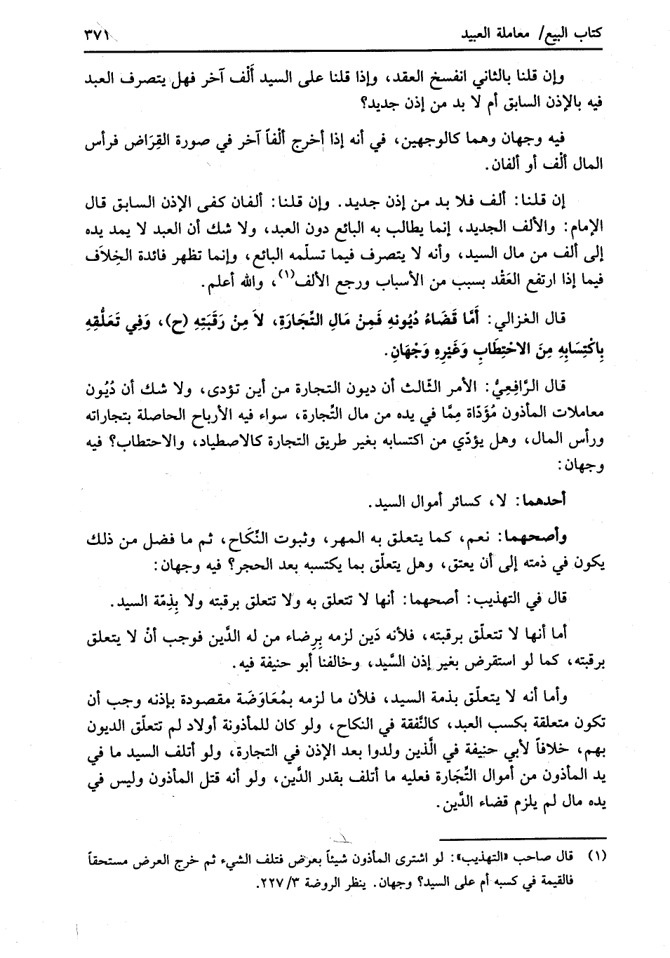 قال الغزالي: أَمَّا قَضَاءُ دُيُونهِ فمِنْ مَالِ التِّجَارَةِ، لاَ مِنْ رَقَبَتِهِ (ح)، وَفِي تَعَلُّقِهِ بِاكْتِسَابِهِ مِنَ الاحْتِطَابِ وَغَيْرِهِ وَجْهَانِ.