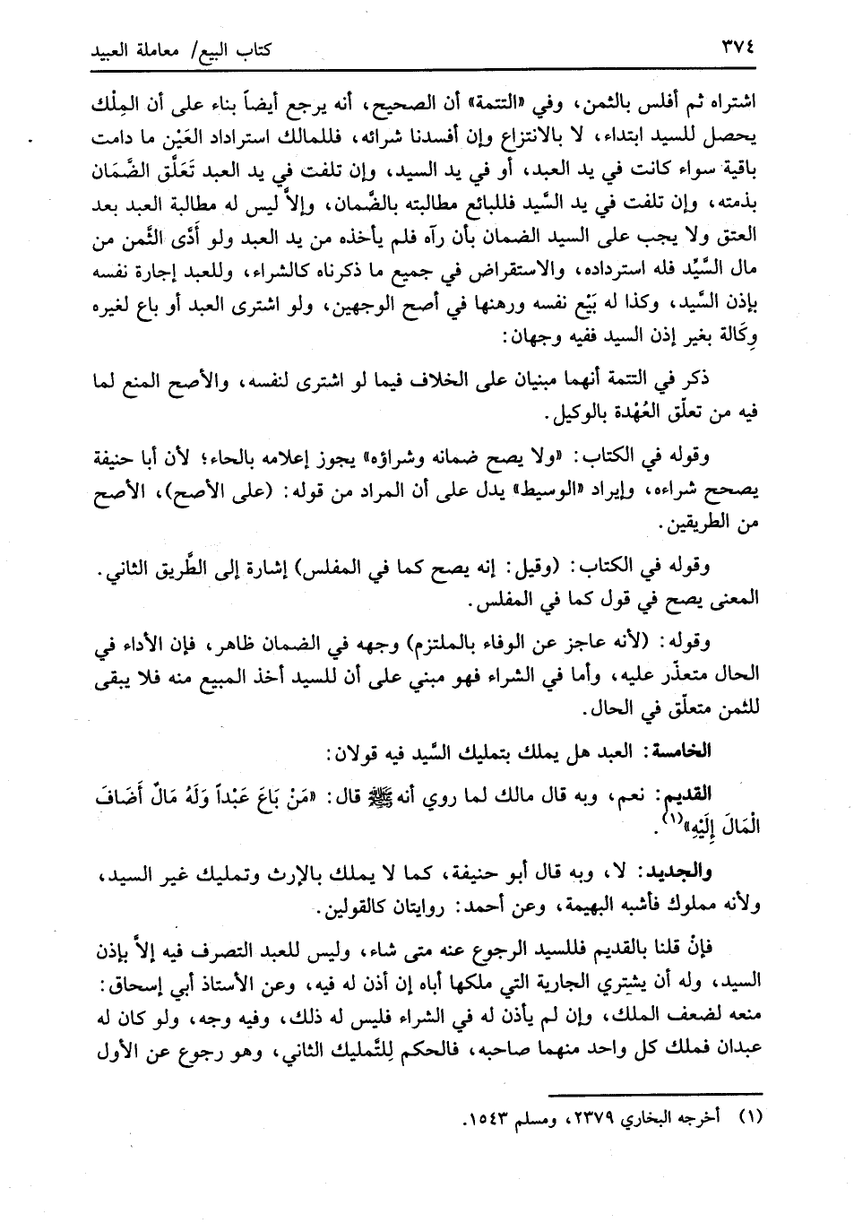 اشتراه ثم أفلس بالثمن، وفي "التتمة" أن الصحيح، أنه يرجع أيضاً بناء على أن المِلْك يحصل للسيد ابتداء، لا بالانتزاع وإن أفسدنا شرائه، فللمالك استراداد العَيْن ما دامت باقية سواء كانت في يد العبد، أو في يد السيد، وإن تلفت في يد العبد تَعَلَّق الضَّمَان بذمته، وإن تلفت في يد السَّيد فللبائع مطالبته بالضَّمان، وإلاَّ ليس له مطالبة العبد بعد العتق ولا يجب على السيد الضمان بأن رآه فلم يأخذه من يد العبد ولو أَدَّى الثَّمن من مال السَّيِّد فله استرداده، والاستقراض في جميع ما ذكرناه كالشراء، وللعبد إجارة نفسه بإذن السَّيد، وكذا له بَيْع نفسه ورهنها في أصح الوجهين، ولو اشترى العبد أو باع لغيره وِكَالة بغير إذن السيد ففيه وجهان: