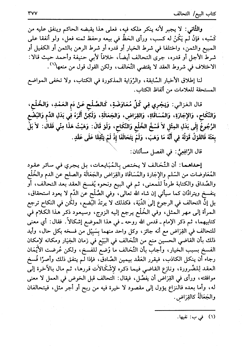 إحداهما: أن التَّحَالف لا يختص بِالمُبَايعات، بل يجري في سائر عقود المُعَاوضات من السّلم والإِجَارة والمُسَاقَاة والقِرَاض والجَعَالَة والصلح عن الدم والخُلْع والصَّداق والكتابة طرداً للمعنى، ثم في البيع ونحوه يُفسخ العقد بعد التحالف، أو ينفسخ ويترادَّان كما سيأتي إن شاء الله تعالى، وفي الصُّلْح عن الدَّمِ لا يعود استحقاق، بل إنَّ التحالف في الرجوع إلى الدِّيَة، فكذلك لا يرتدّ البُضع، ولكن في النكاح ترجع المرأة إلى مهر المثل، وفي الخُلْع يرجع إليه الزوج، وسيعود ذكر هذا الكلام في كتابيهما، ثم ذكر الإمام -قدس الله روحه- في هذا الموضع إشكالاً. فقال: أي معنى للتحالف في القِرَاض مع أنه جائز، وكل واحد منهما بسَبِيْل من فسخه بكل حال، وأيد ذلك بأن القاضي الحسين منع من التحَالف في البَيعَ في زمان الخِيَار ومكانه لإمكان الفسخ بسبب الخيار، وأجاب بأن التَّحَالف ما وُضع للفسخ، ولكن عُرضت الأَيْمَان رجاء أن ينكل الكاذب، فيقرر العَقْد بيمين الصَّادق، فإذا لم يتفق ذلك وأصرَّا فُسخ العقد لِلضَّرورة، ونازع القاضي فيما ذكره لإِشْكَالاَت قررها، ثم مال بالآخرة إلى موافقته، ورأى في القِرَاض أن يفصَّل، فيقال: التحالف قبل الخوض في العمل لا معنى له، وأما بعده فالنزاع يؤول إلى مقصود لا خيرة فيه من ربح أو أجر مثل، فيتحالفان والجَعَالَةُ كالقِرَاضِ.