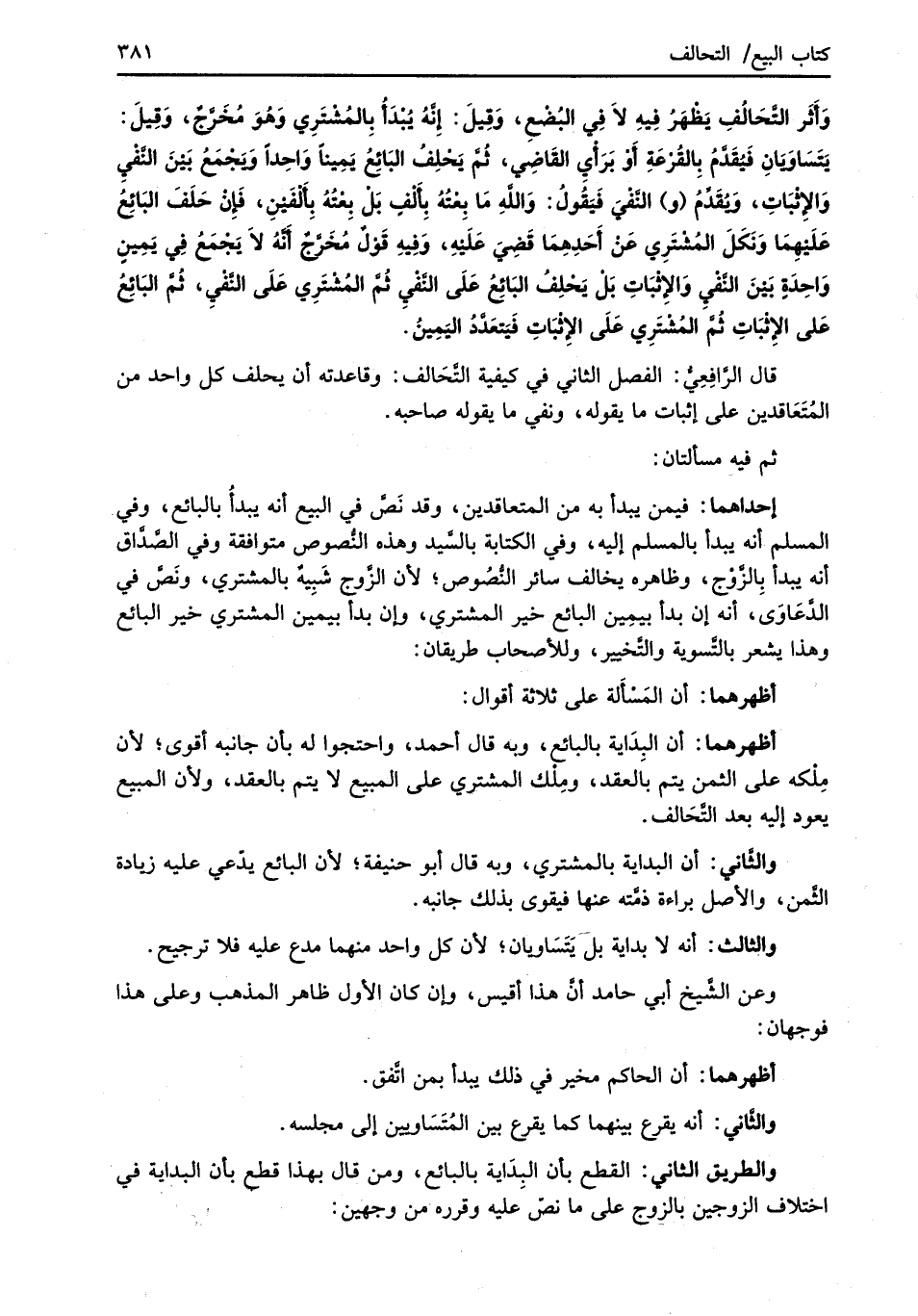 إحداهما: فيمن يبدأ به من المتعاقدين، وقد نَصَّ في البيع أنه يبدأُ بالبائع، وفي المسلم أنه يبدأ بالمسلم إليه، وفي الكتابة بالسَّيد وهذه النُّصوص متوافقة وفي الصَّدَّاق أنه يبدأ بِالزَّوْج، وظاهره يخالف سائر النُّصُوص؛ لأن الزَّوج شَبِيهٌ بالمشتري، ونَصَّ في الدَّعَاوَى، أنه إن بدأ بيمِين البائع خير المشتري، وإن بدأ بيمين المشتري خير البائع وهذا يشعر بالتَّسوية والتَّخيير، وللأصحاب طريقان: