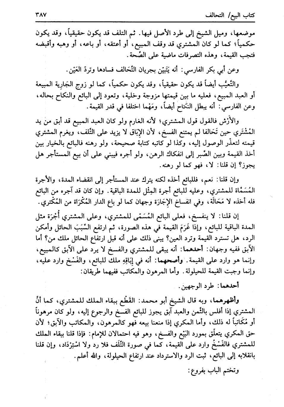 موضعها، وميل الشيخ إلى طرد الأصل فيها. ثم التلف قد يكون حقيقياً، وقد يكون حكمياً؛ كما لو كان المشتري قد وقف المبيع، أو أعتقه، أو باعه، أو وهبه وأقبضه فتجب القيمة، وهذه التصرفات ماضية على الصِّحة.