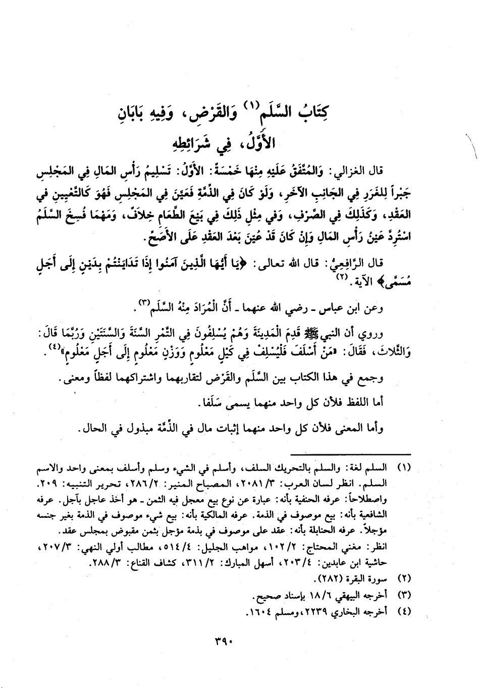 قال الغزالي: وَالمُتَّفَقُ عَلَيهِ مِنْهَا خَمْسَةٌ: الأَوَّلُ: تَسْلِيمُ رَأْسِ المَالِ فِي المَجْلِسِ جَبْراً لِلغَرَرِ فِي الجَانِبِ الآخَرِ، وَلَوْ كانَ فِي الذِّمَّةِ فَعَيَّنَ فِي المَجْلِسِ فَهُوَ كالتَّعْيِينِ في العَقْدِ، وَكَذَلِكَ فِي الصَّرْفِ، وَفي مِثْلِ ذَلِكَ فِي بَيْعَ الطَّعَامِ خِلاَفٌ، وَمَهْمَا فُسِخَ السَّلَمُ اسْتُرِدَّ عَيْنُ رَأْسِ المَالِ وَإِنْ كَانَ قَدْ عُيّنَ بَعْدَ العَقْدِ عَلَى الأَصَحِّ.